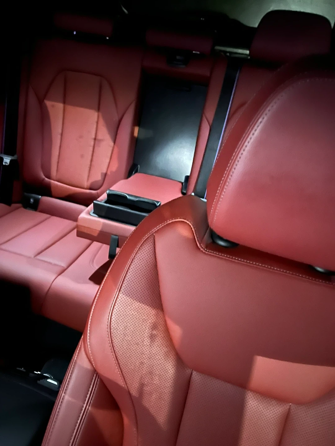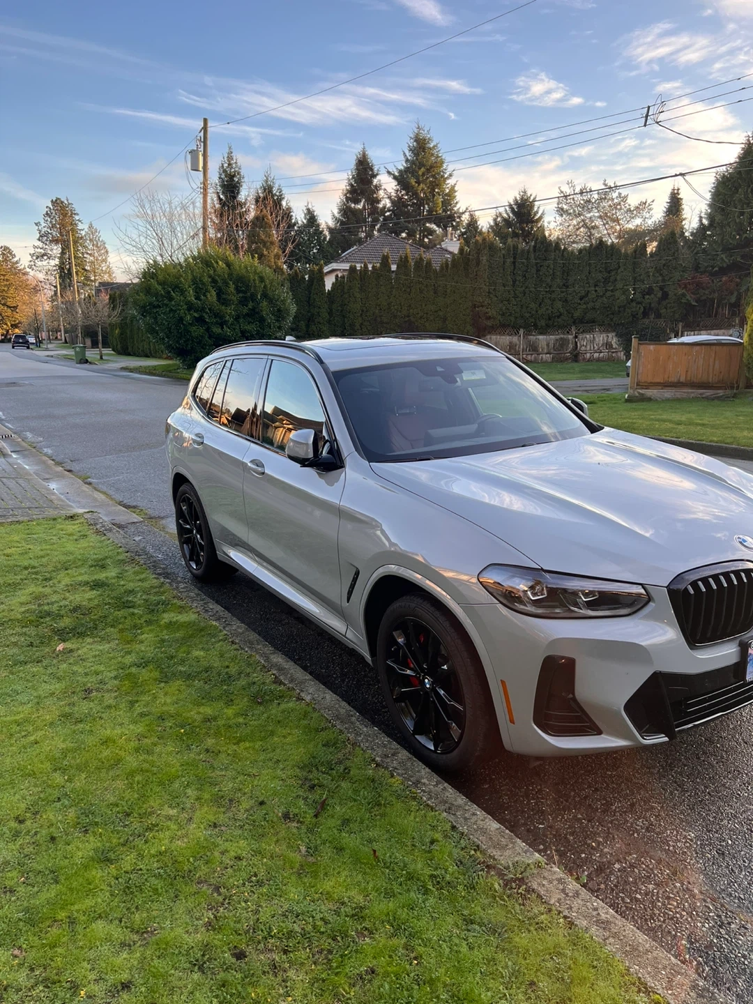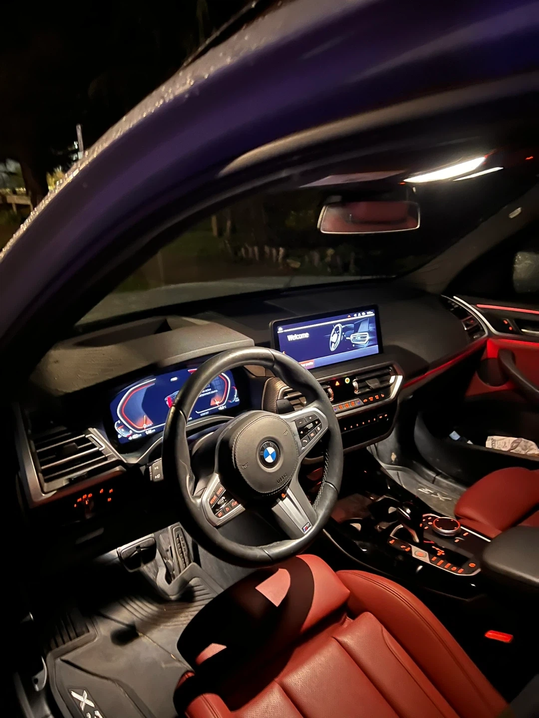 Grey BMW X3 M Sport with red leather interior. Features a panoramic sunroof and premium sound system. This SUV offers a luxurious and sporty driving experience.