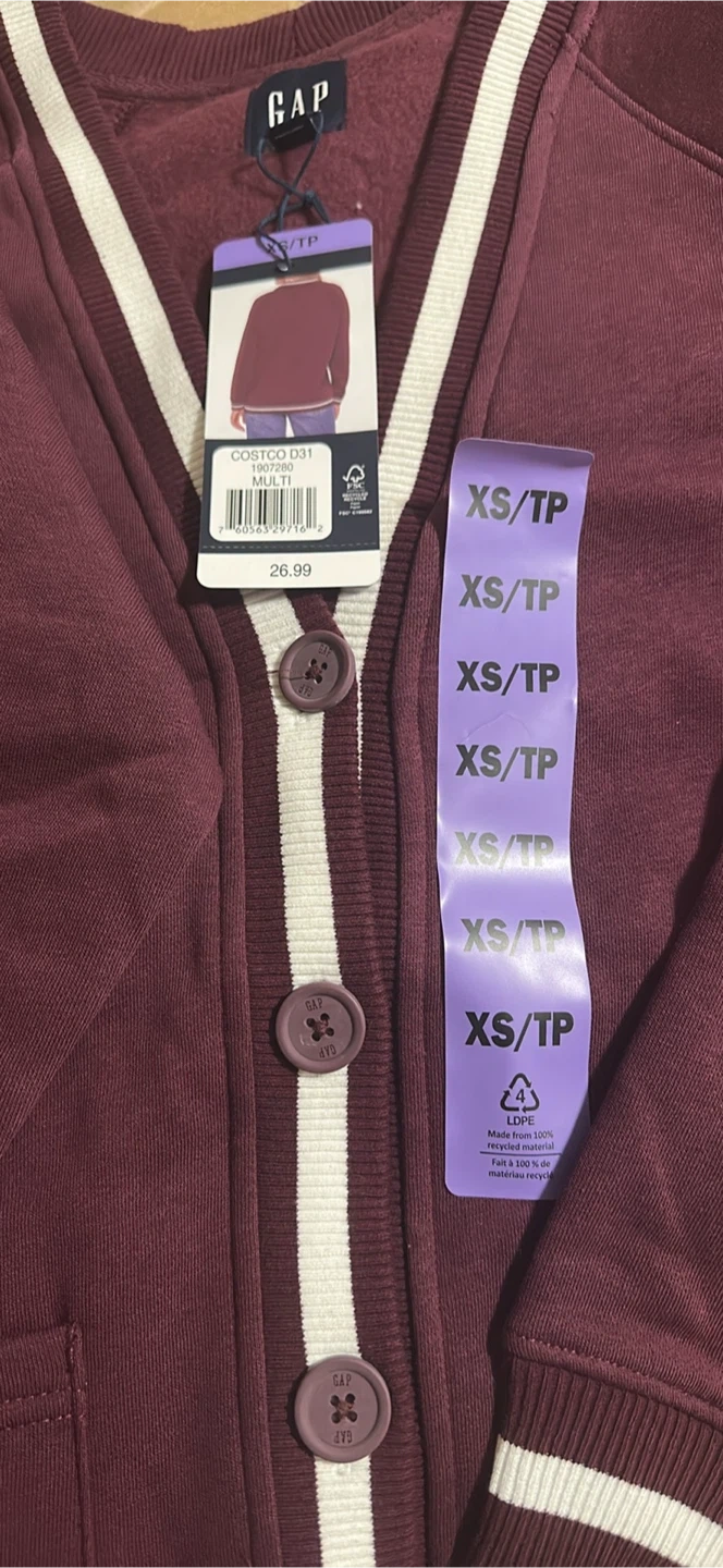 This is a brand new Gap varsity cardigan in size XS! It's a lovely burgundy colour with white stripes. The cardigan is made of 100% cotton and still has the original tags attached. Originally bought for $26.99 at Costco! Have in 3 colours