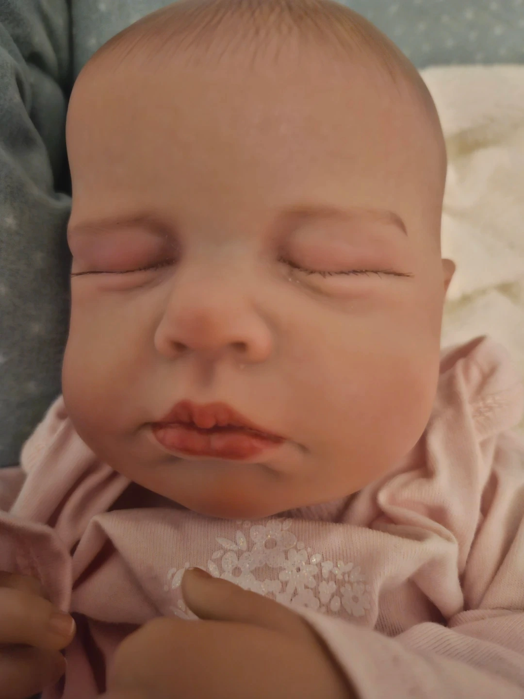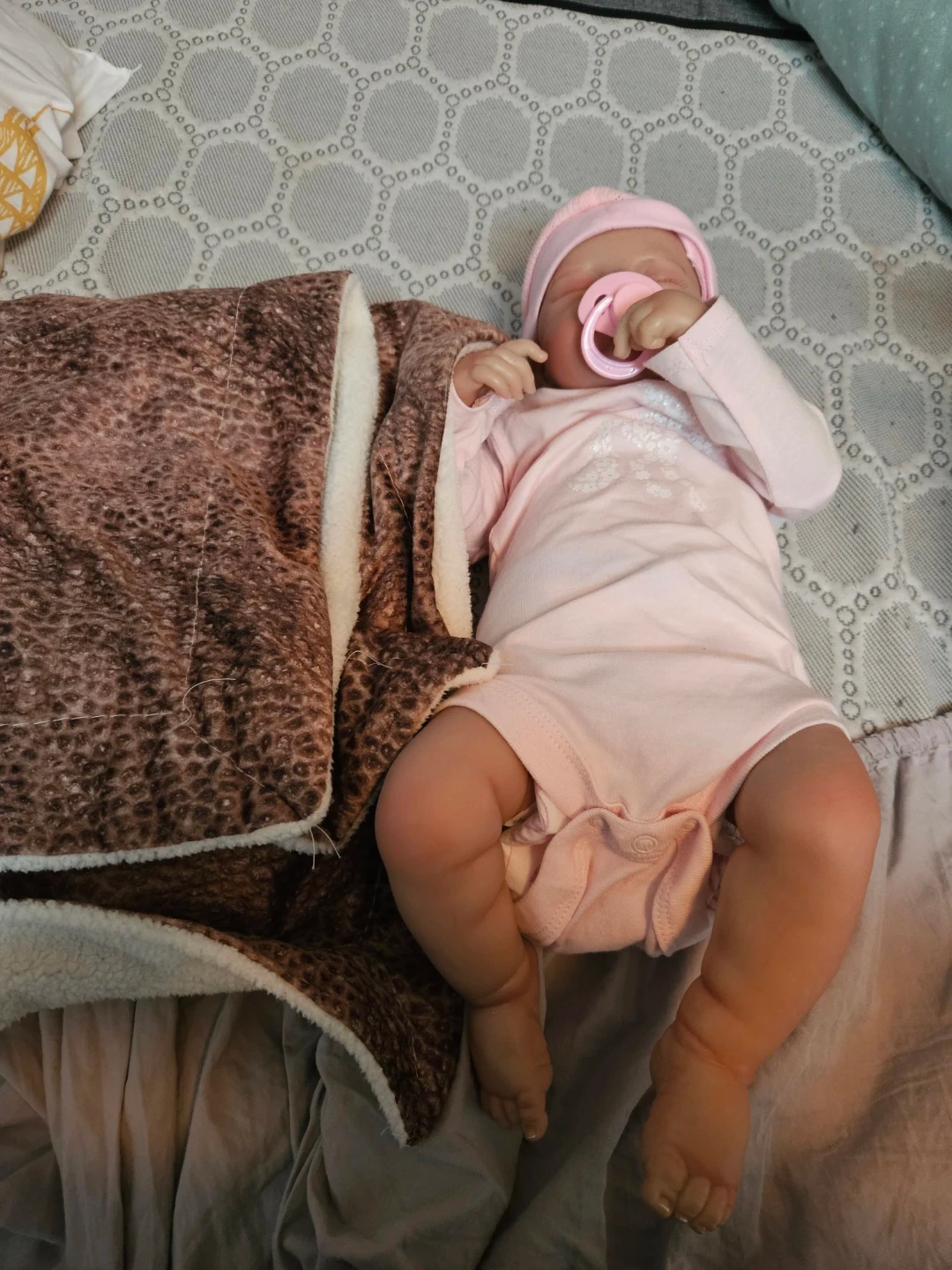 Lifelike reborn baby doll dressed in a soft pink onesie. This sweet doll comes with a matching pink hat and pacifier. It's designed to look and feel like a real baby, perfect for play or display.