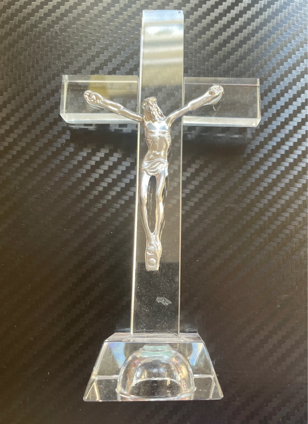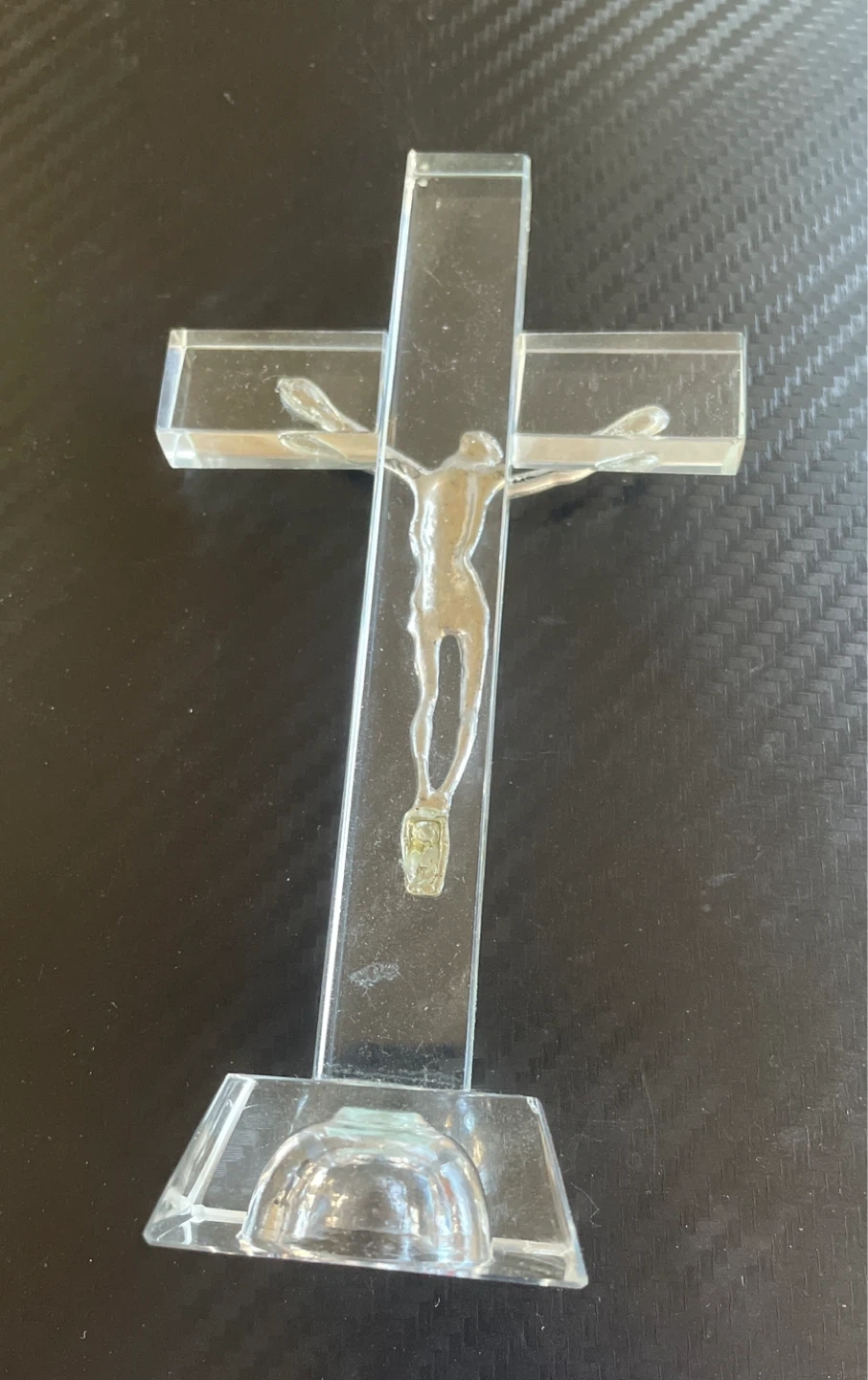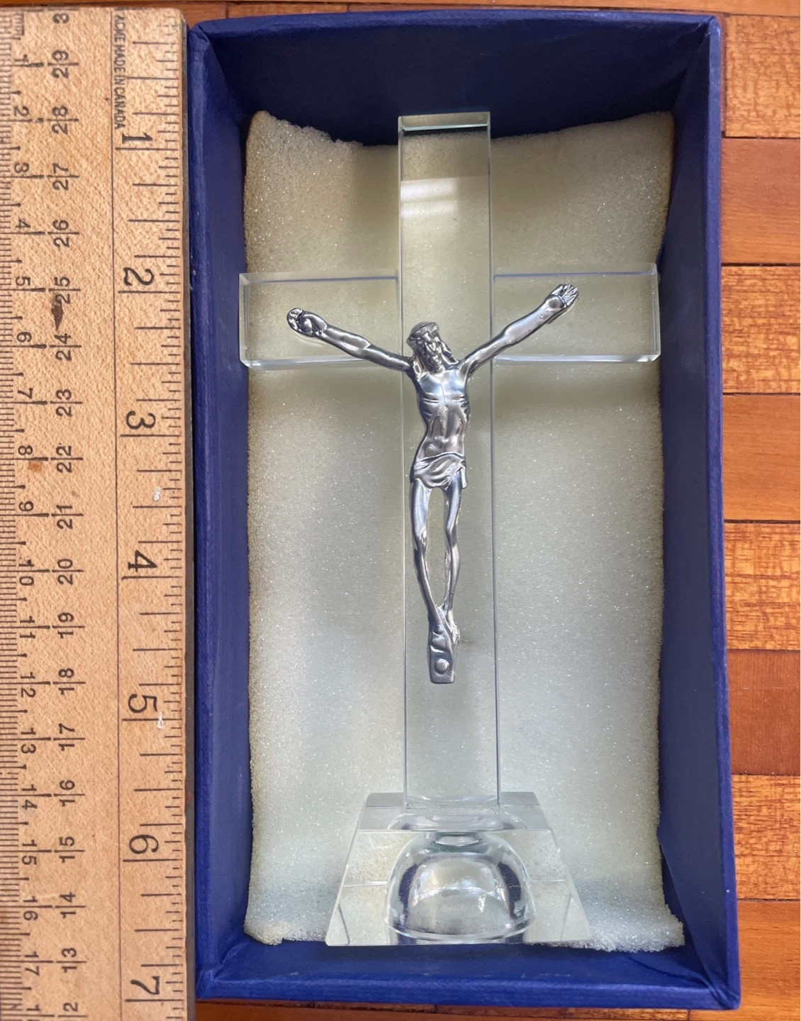 This is a decorative crystal cross with a Jesus figure. It comes with its original blue box and foam padding. The cross has a clear crystal appearance.