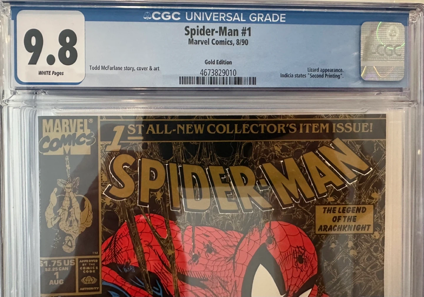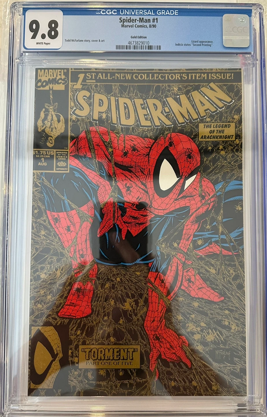 This is a CGC graded Spider-Man #1 Gold Edition comic book, graded 9.8. It features Todd McFarlane's story and art. This 1st all-new collector's item issue is from Marvel Comics, 8/90. It's the "Second Printing".