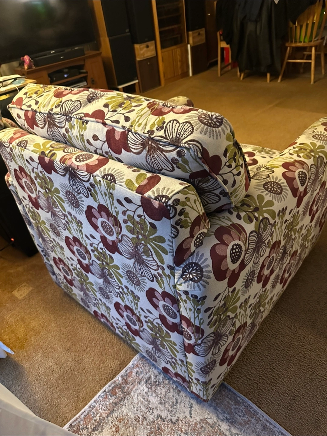 Selling a comfortable armchair with a lovely floral pattern! It's in great condition and would be a cozy addition to any living room or reading nook. The chair features a sturdy frame and soft cushioning, perfect for relaxing after a long day.