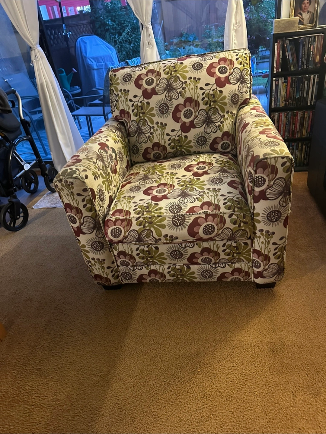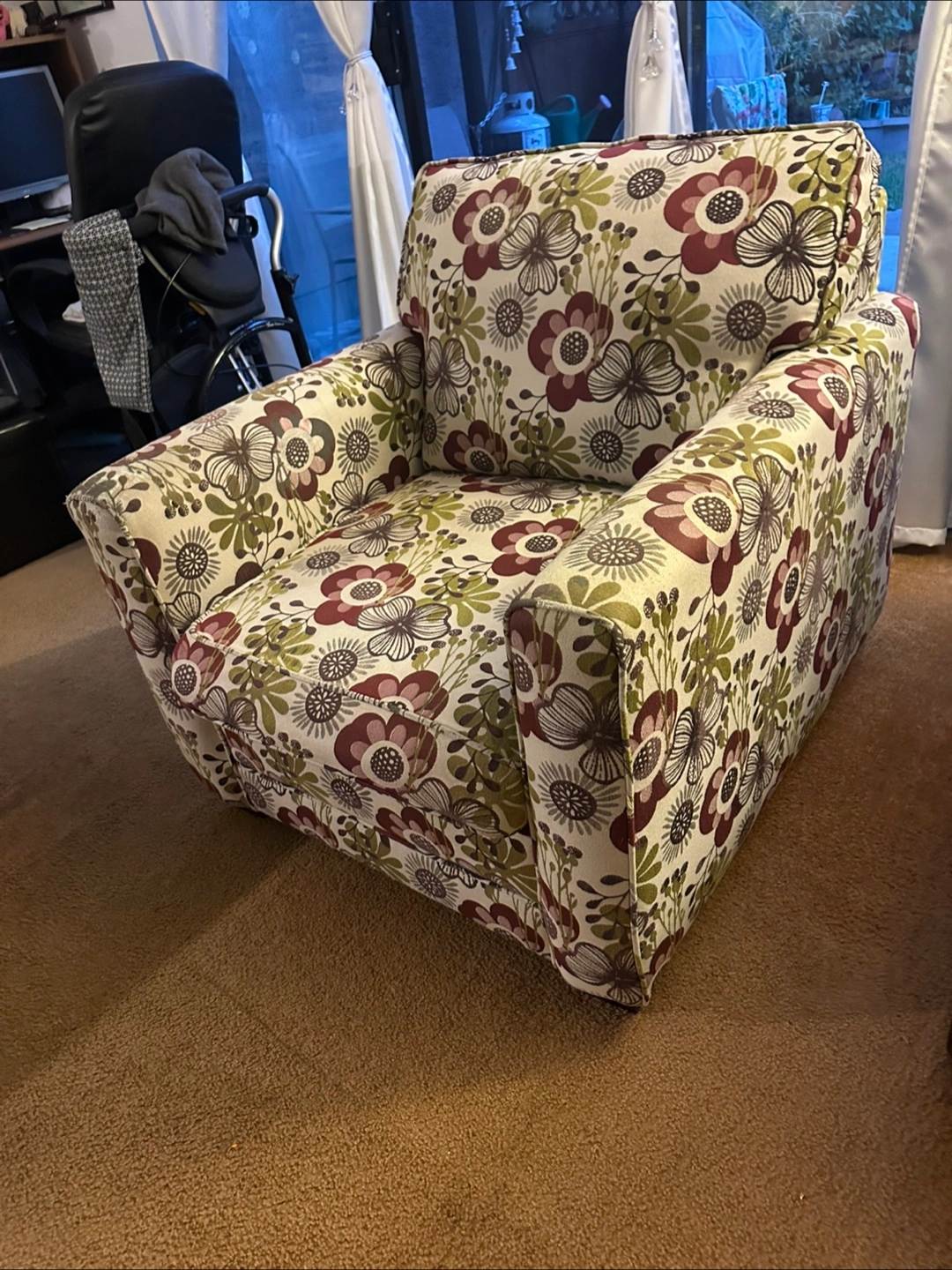 Selling a comfortable armchair with a lovely floral pattern! It's in great condition and would be a cozy addition to any living room or reading nook. The chair features a sturdy frame and soft cushioning, perfect for relaxing after a long day.