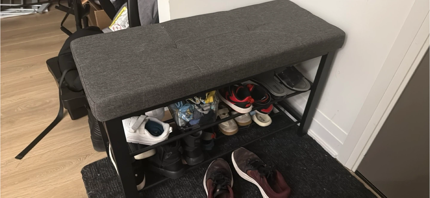 Here's a handy shoe rack bench to keep your entryway organized! It features a comfortable grey cushioned seat and two shelves for storing shoes.