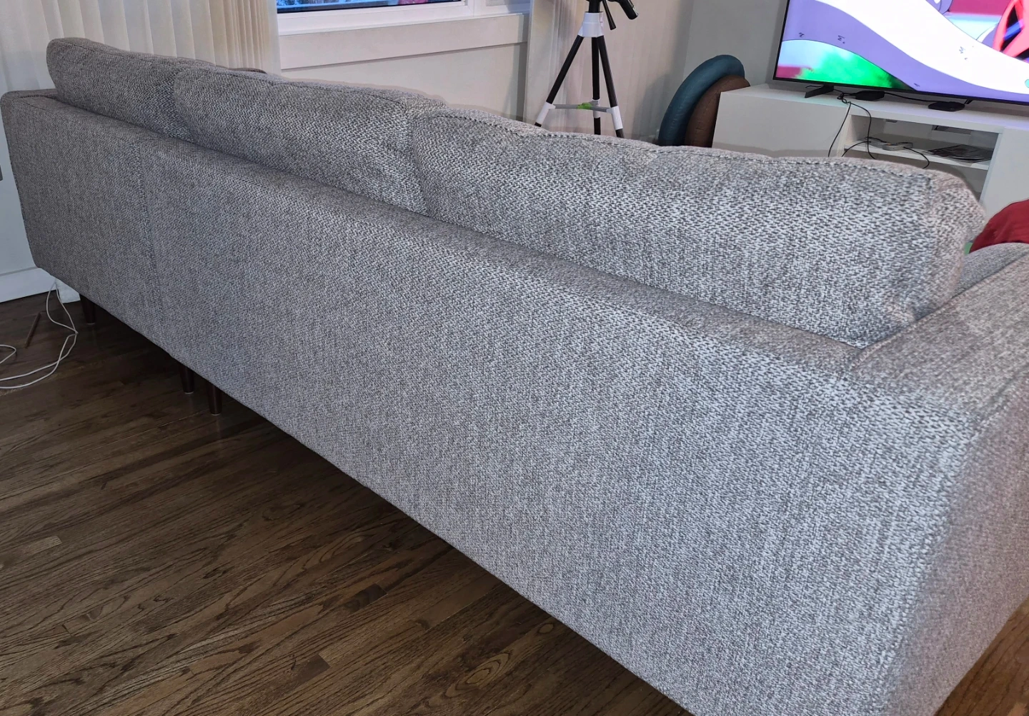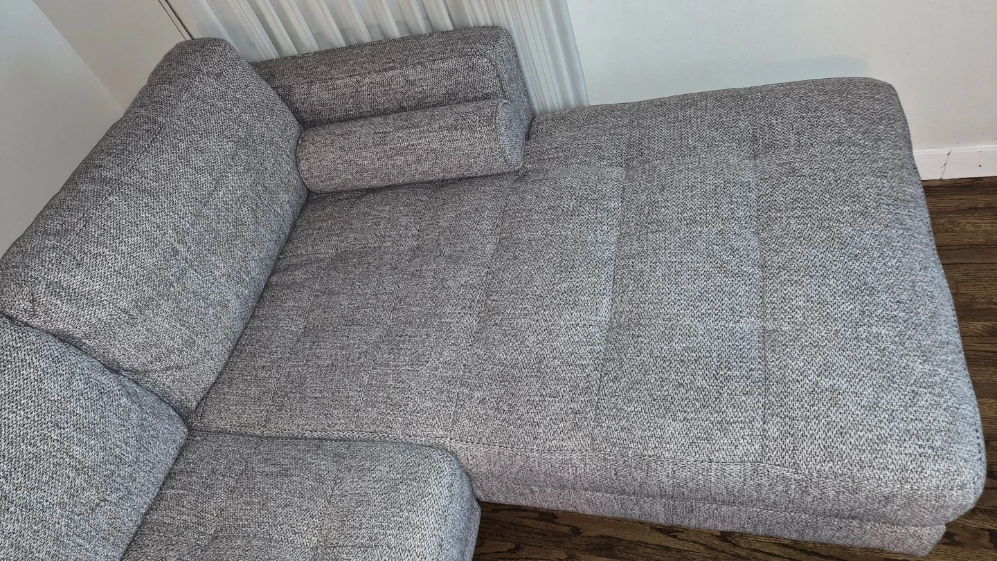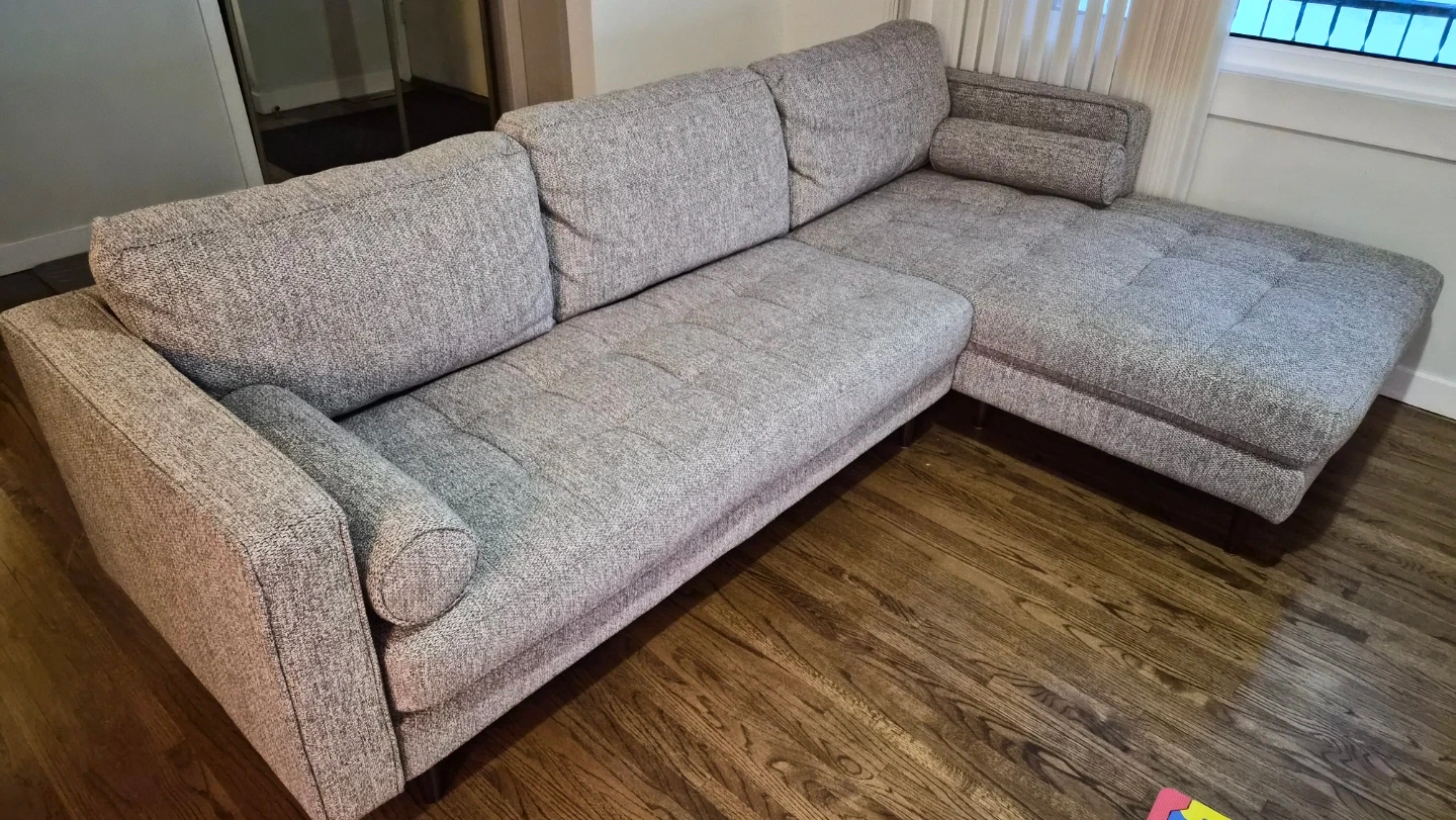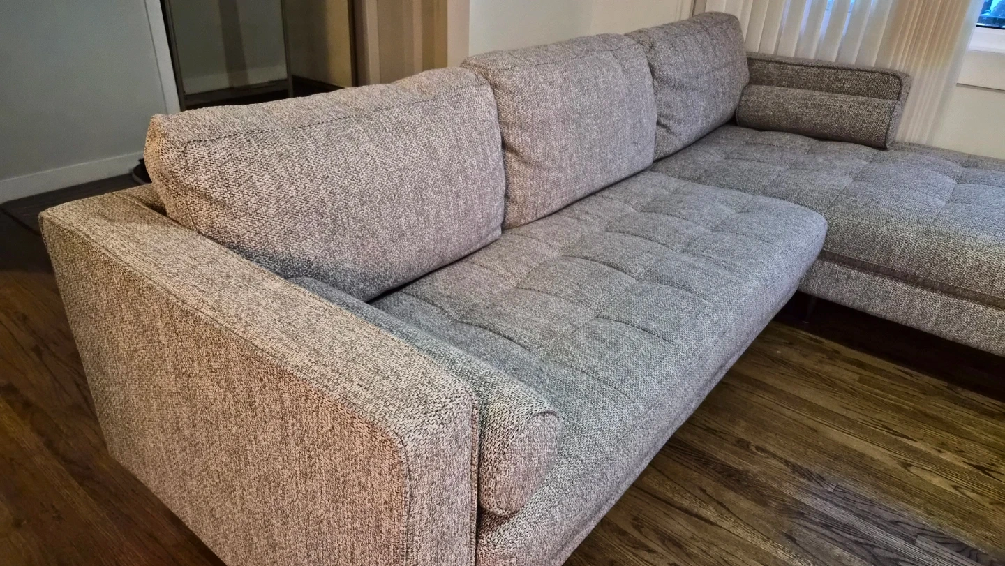 This comfortable sectional sofa features a textured fabric. It's perfect for lounging and has a chaise section for extra seating. The sofa's neutral colour makes it easy to match with any decor.