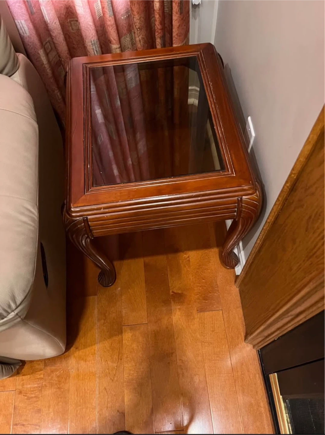This is a lovely brown wood end table featuring a glass top. It's in good condition and would make a great addition to any living room or bedroom. Set of 3