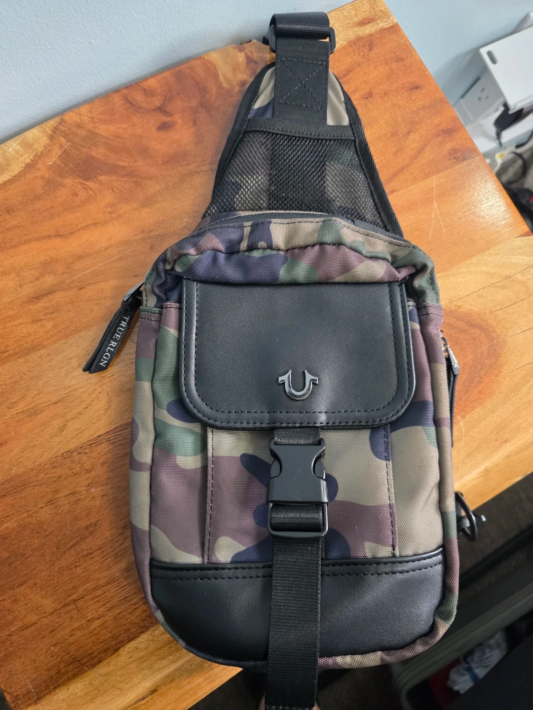 This is a True Religion sling bag with a camouflage print. It has faux leather trim and a buckle closure. The strap is adjustable for a comfortable fit.zipper stuck half way price reflected for quick sale