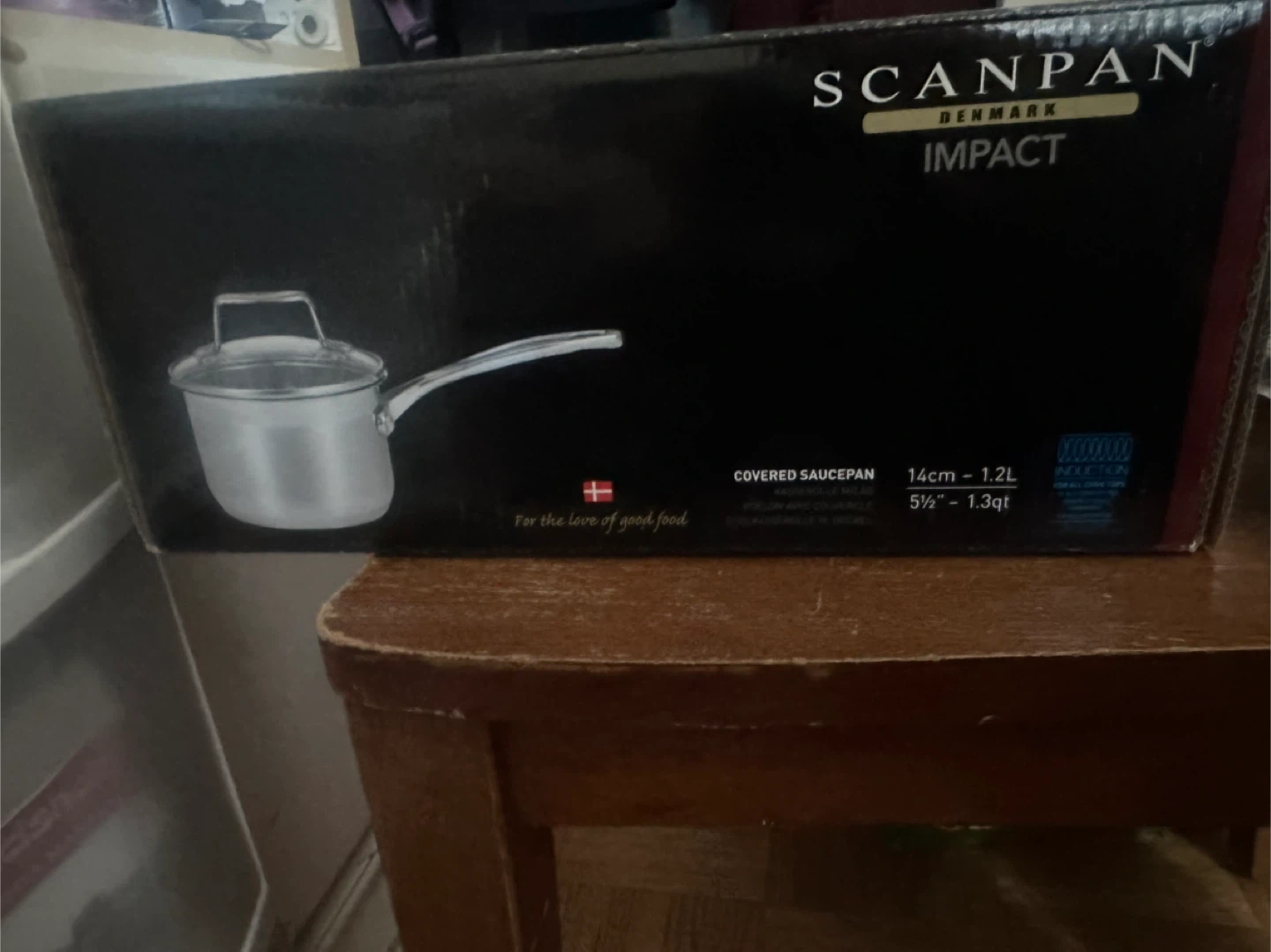 This is a brand new Scanpan Impact 1.2L covered saucepan, renowned for its quality and durability, featuring a stainless steel body and an impact-bonded aluminum base for even heat distribution. It's suitable for all energy sources, including induction.