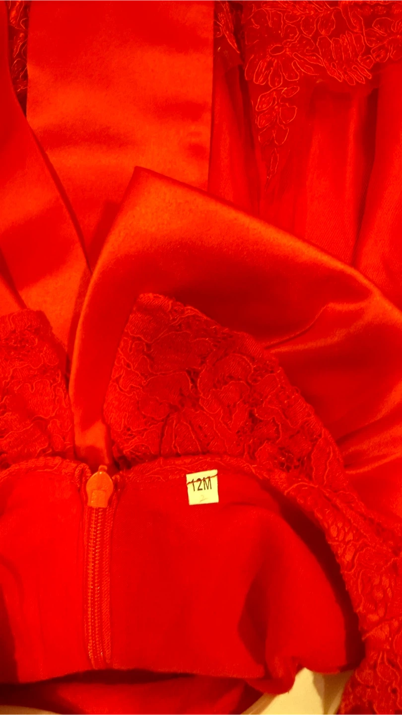 Adorable red baby dress in size 12M! It features a beautiful lace trim and a big bow. Perfect for a special occasion or just to dress up your little one