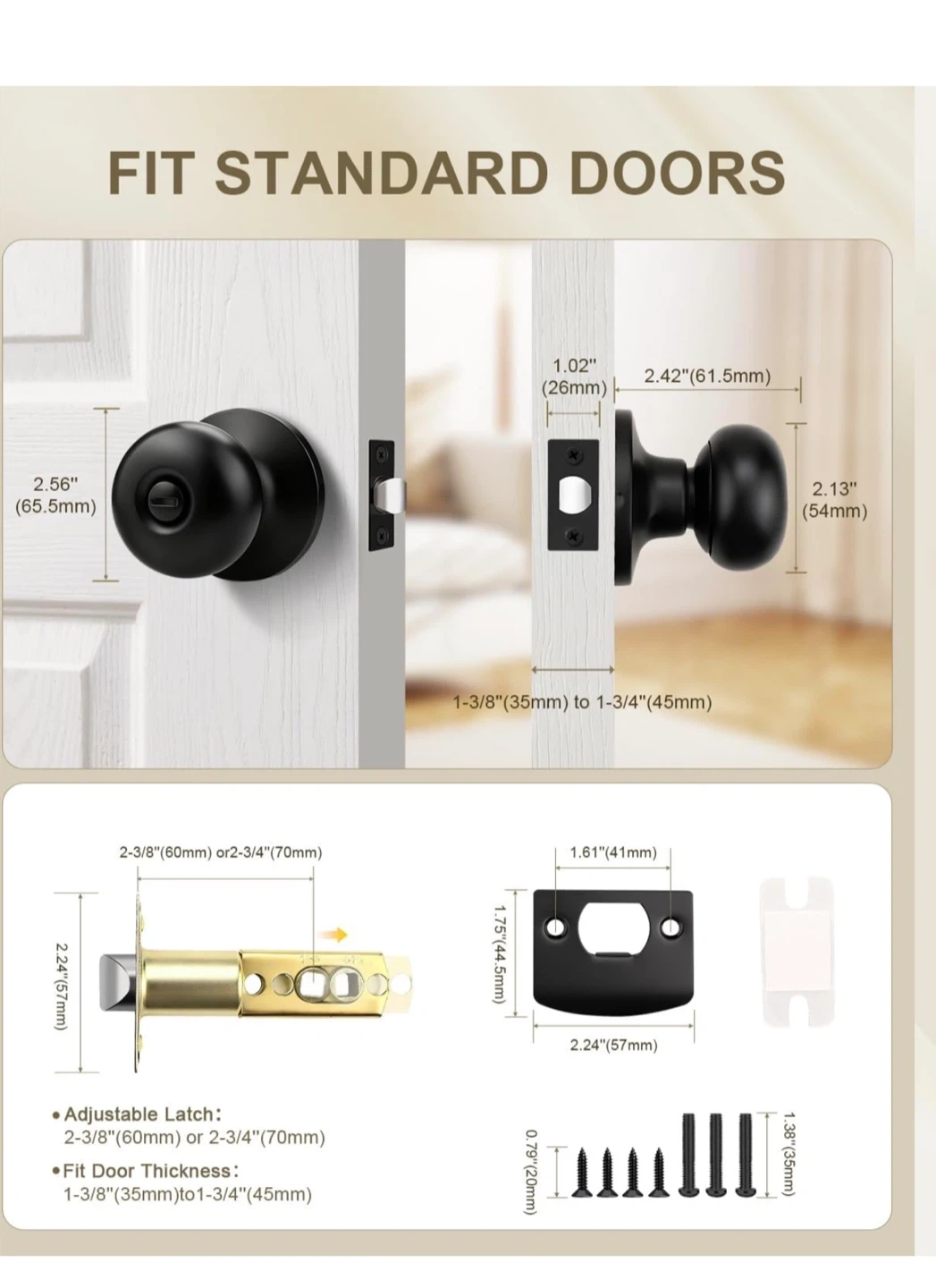 This is a set of 6 privacy door knobs in a matte black finish. They feature a sturdy internal construction and a stainless steel latch. These knobs are ANSI Grade Standard certified and passed 200,000 open & close cycle tests. They're built to last over 60 years.