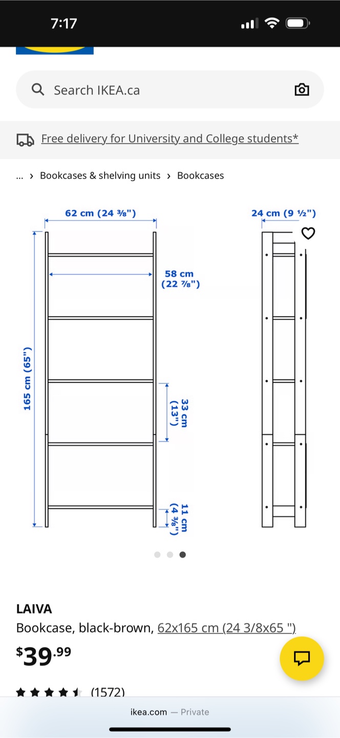 Looking to sell my IKEA LAIVA bookcase in black-brown! It's in great shape and ready for a new home. Dimensions are 62x165 cm (24 3/8x65 ")