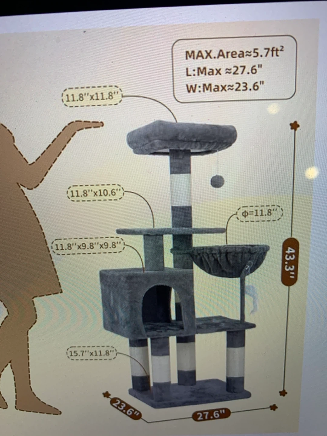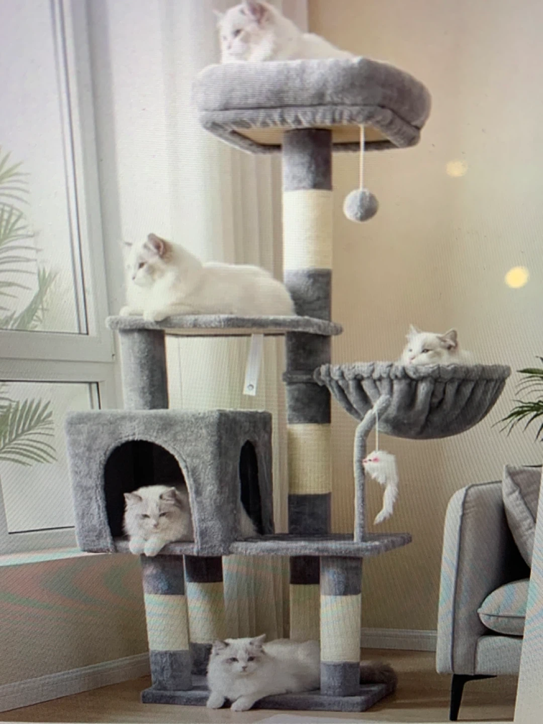 This multi-level cat tree condo is made with soft grey plush material and sisal scratching posts. It features a cozy enclosed condo, a spacious hammock, and platforms for climbing and lounging. Includes a dangling toy for added entertainment!