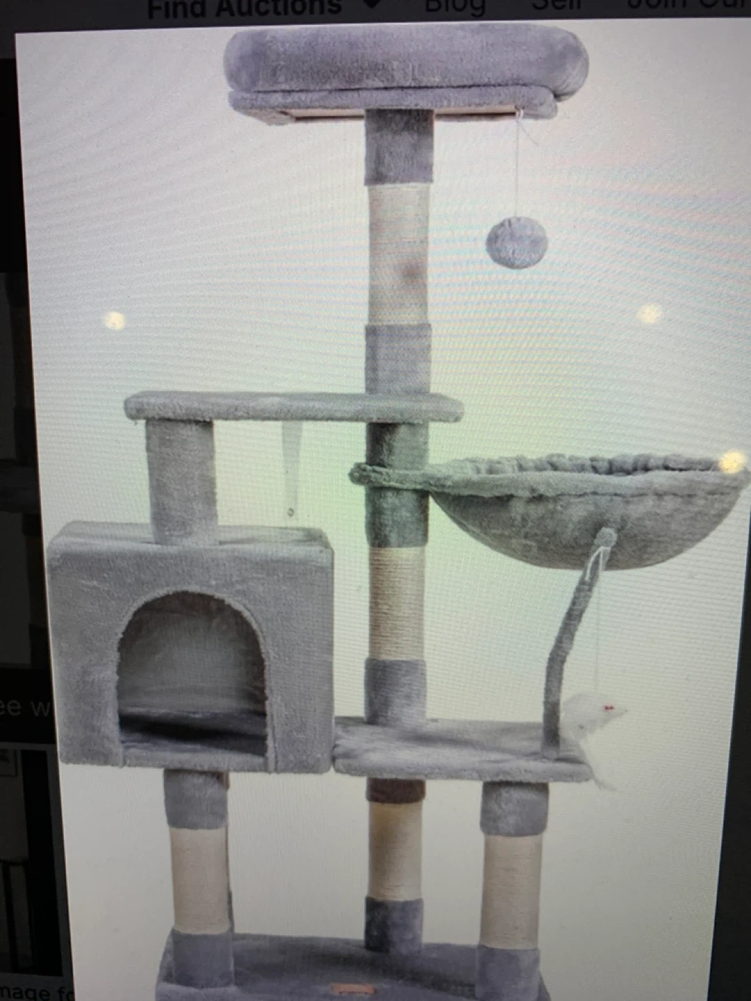 This multi-level cat tree condo is made with soft grey plush material and sisal scratching posts. It features a cozy enclosed condo, a spacious hammock, and platforms for climbing and lounging. Includes a dangling toy for added entertainment!