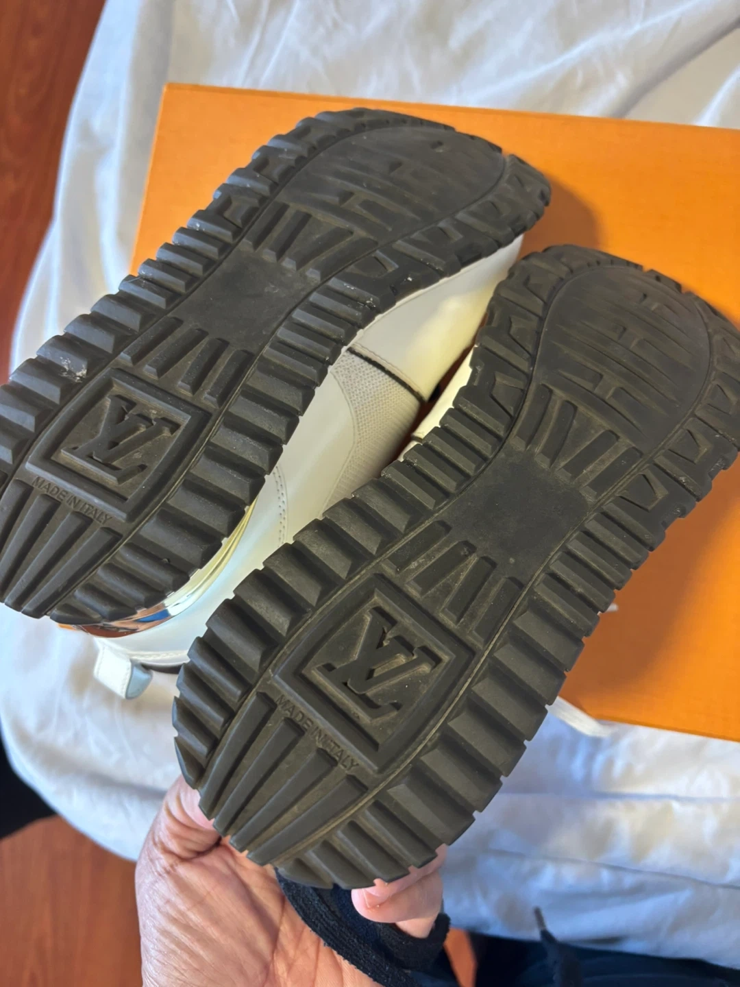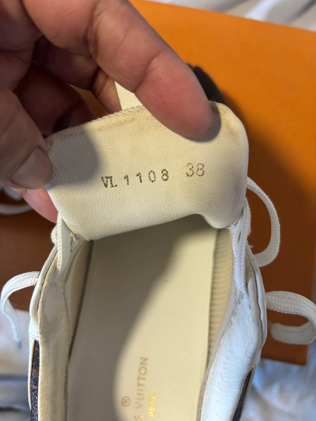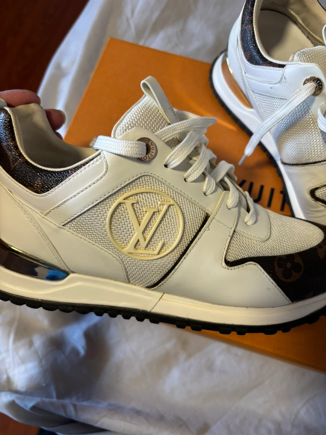 White and brown Louis Vuitton "Run Away" sneakers. Size 38. Leather and textile construction. Made in Italy. Includes original box.