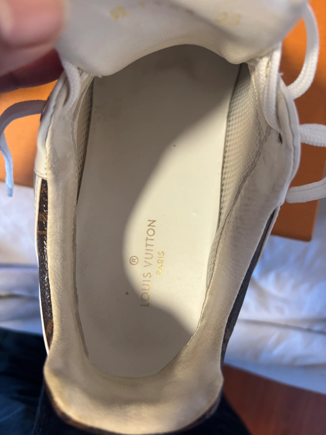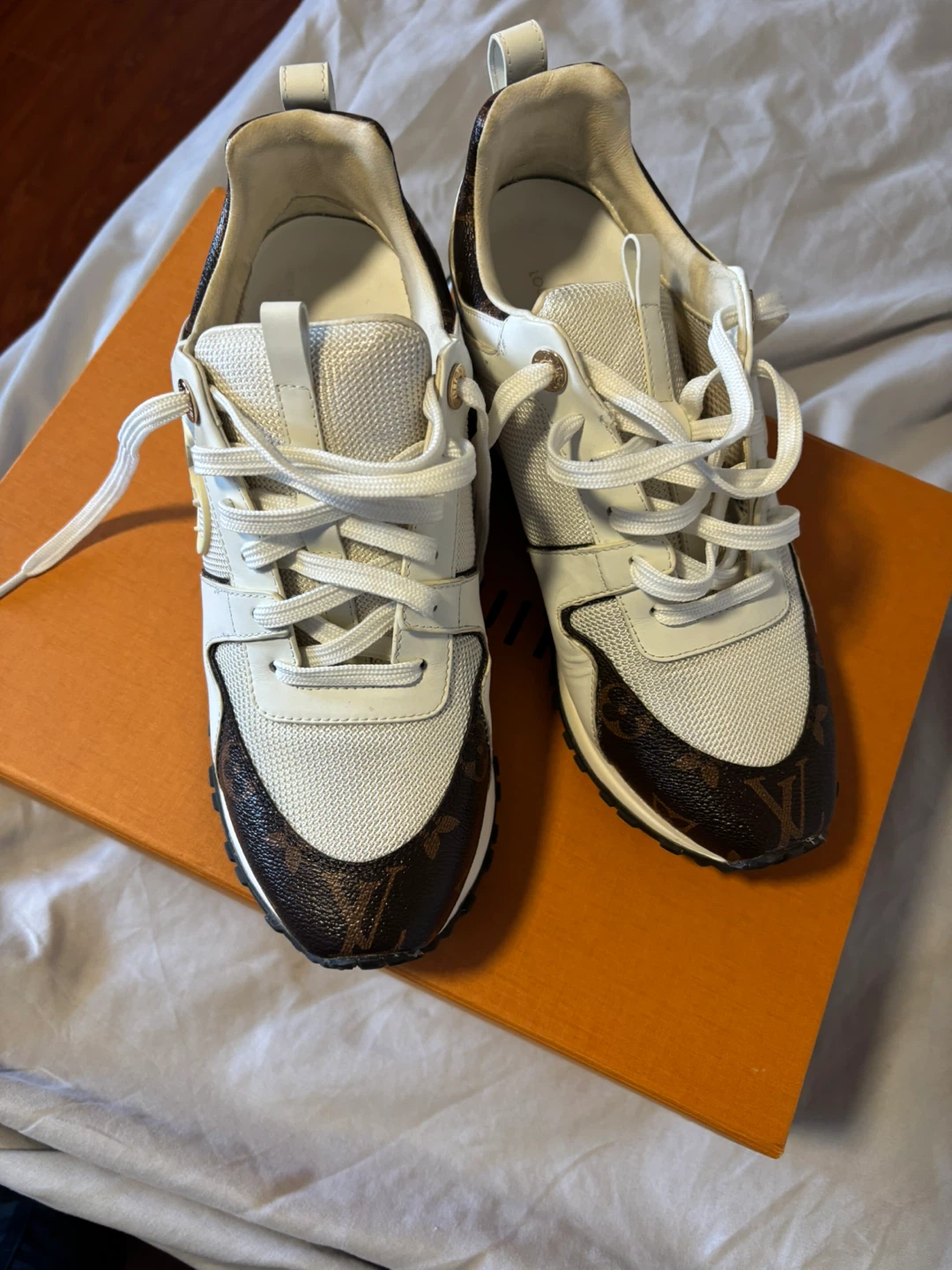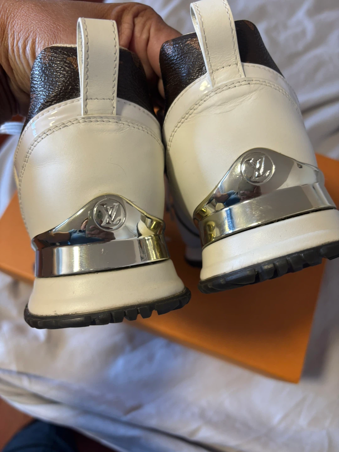 White and brown Louis Vuitton "Run Away" sneakers. Size 38. Leather and textile construction. Made in Italy. Includes original box.