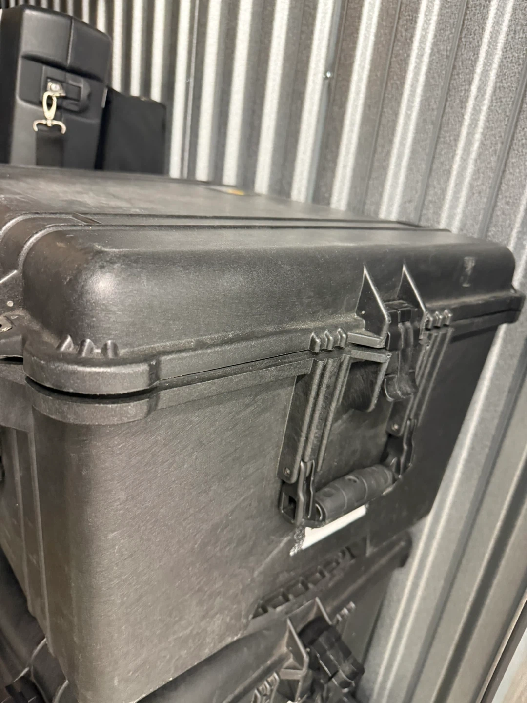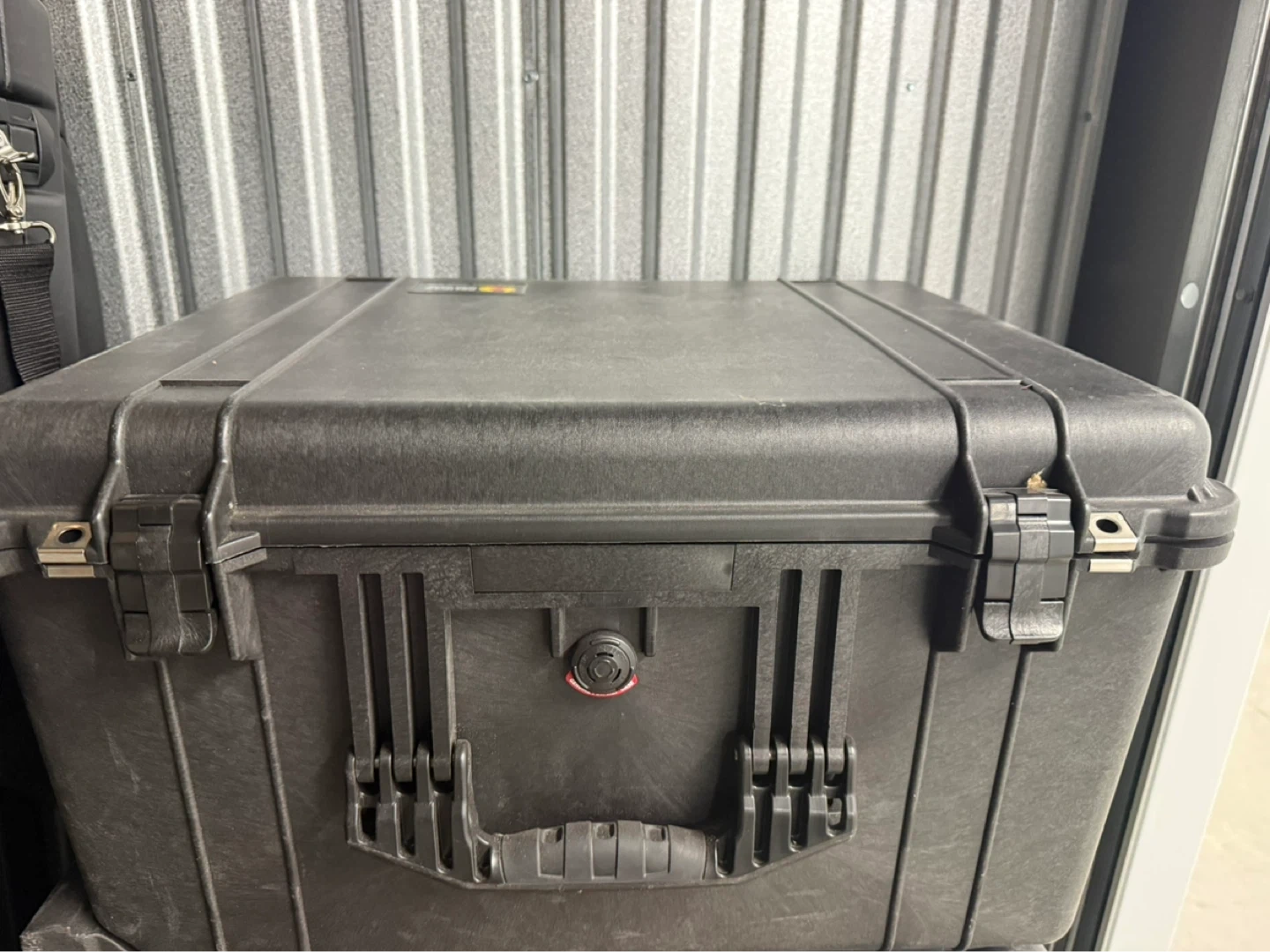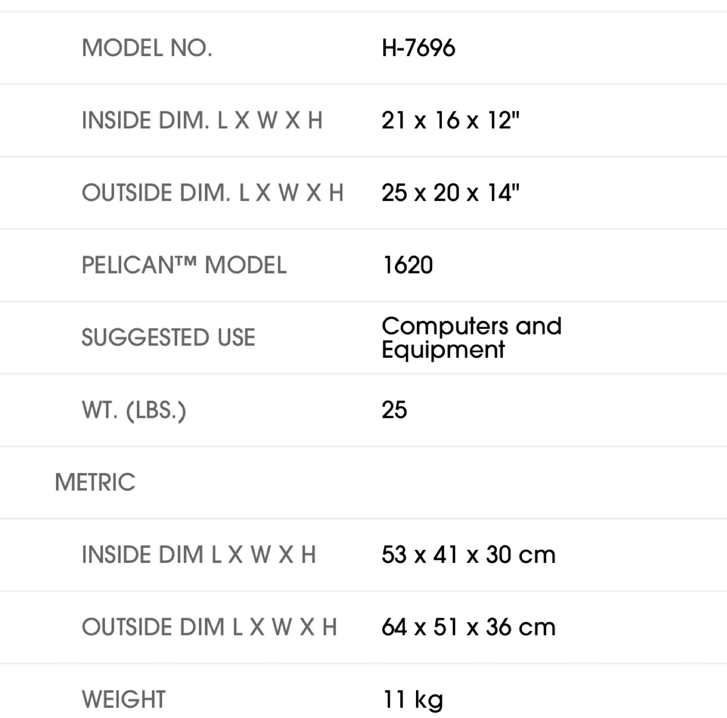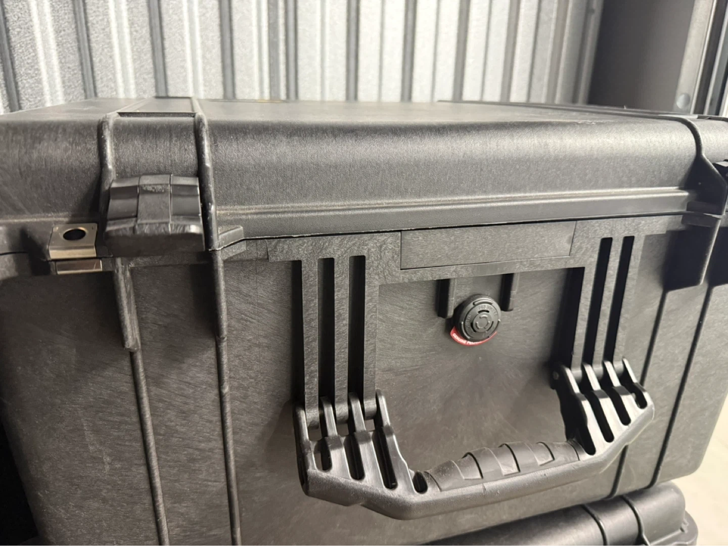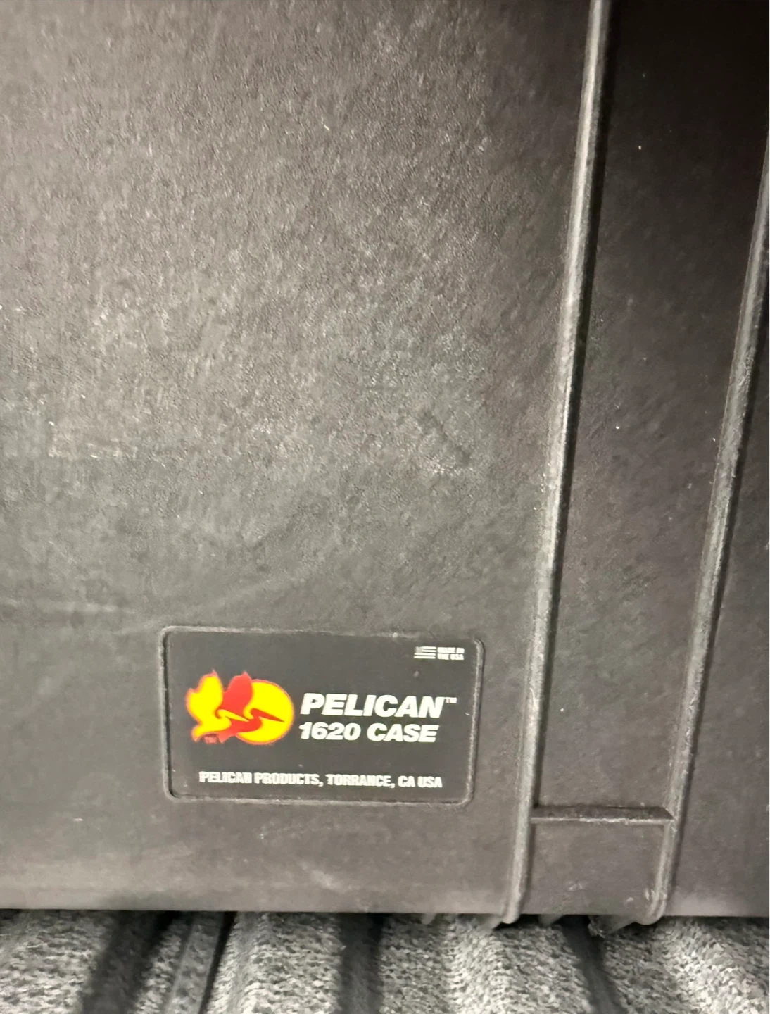 Pelican 1620 equipment case in black. It's crushproof and designed for impact, vibration, and shock protection. Includes wheels and a retractable handle for easy transport. Inside dimensions are 21 x 16 x 12 inches.