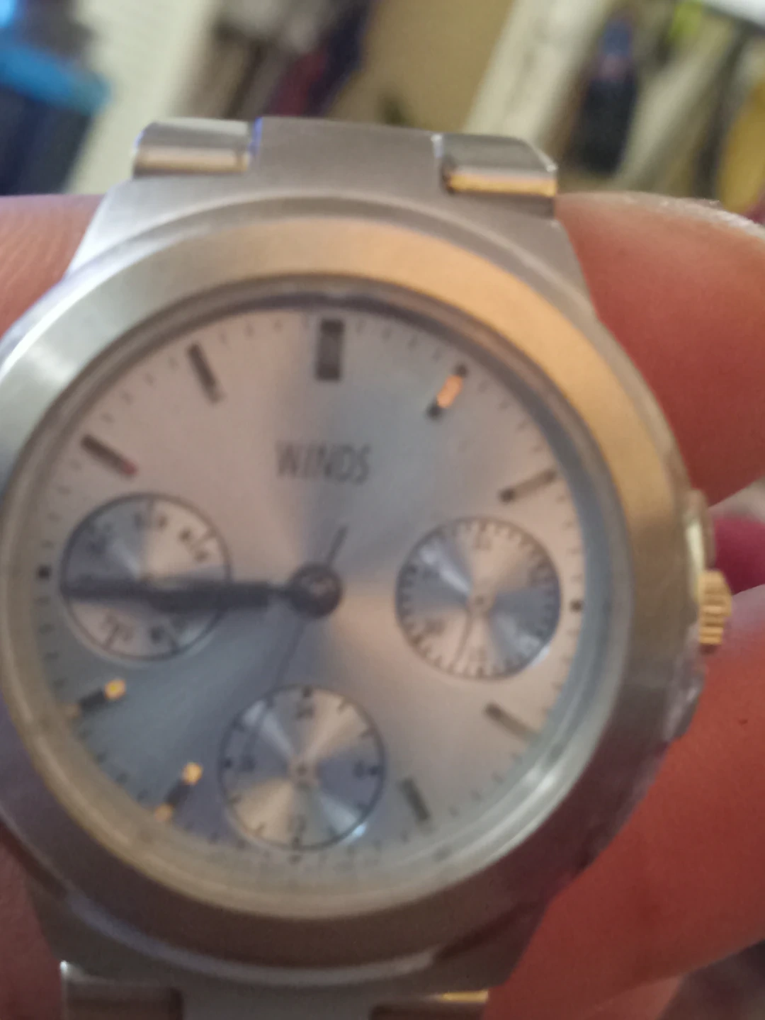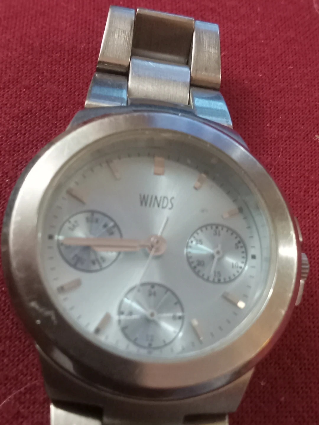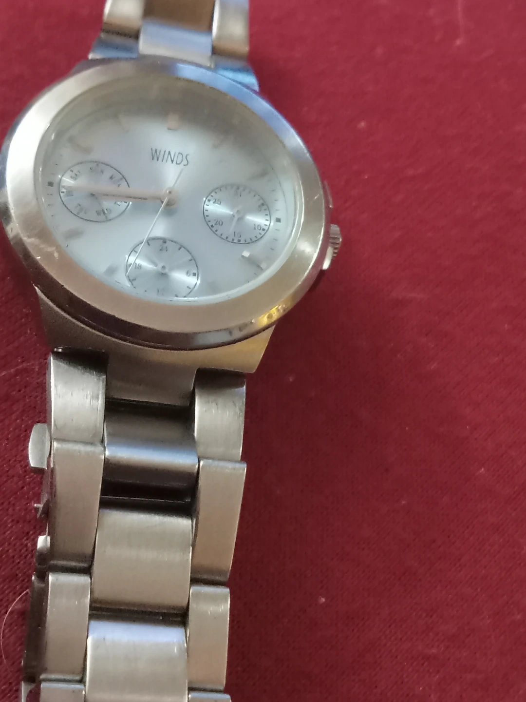 Selling a Winds silver watch. It has a stainless steel band and a silver face with three subdials. It's in good condition.
