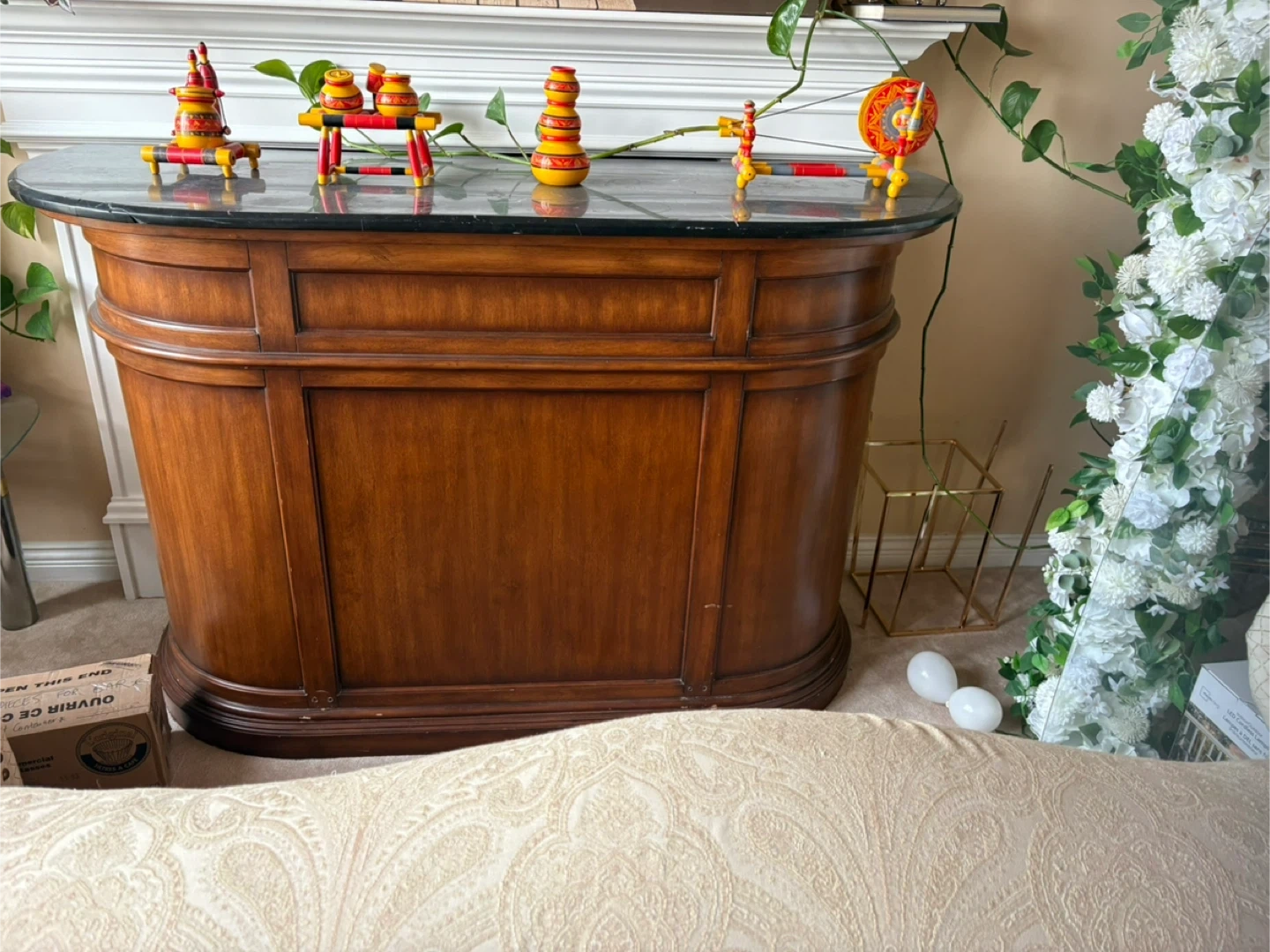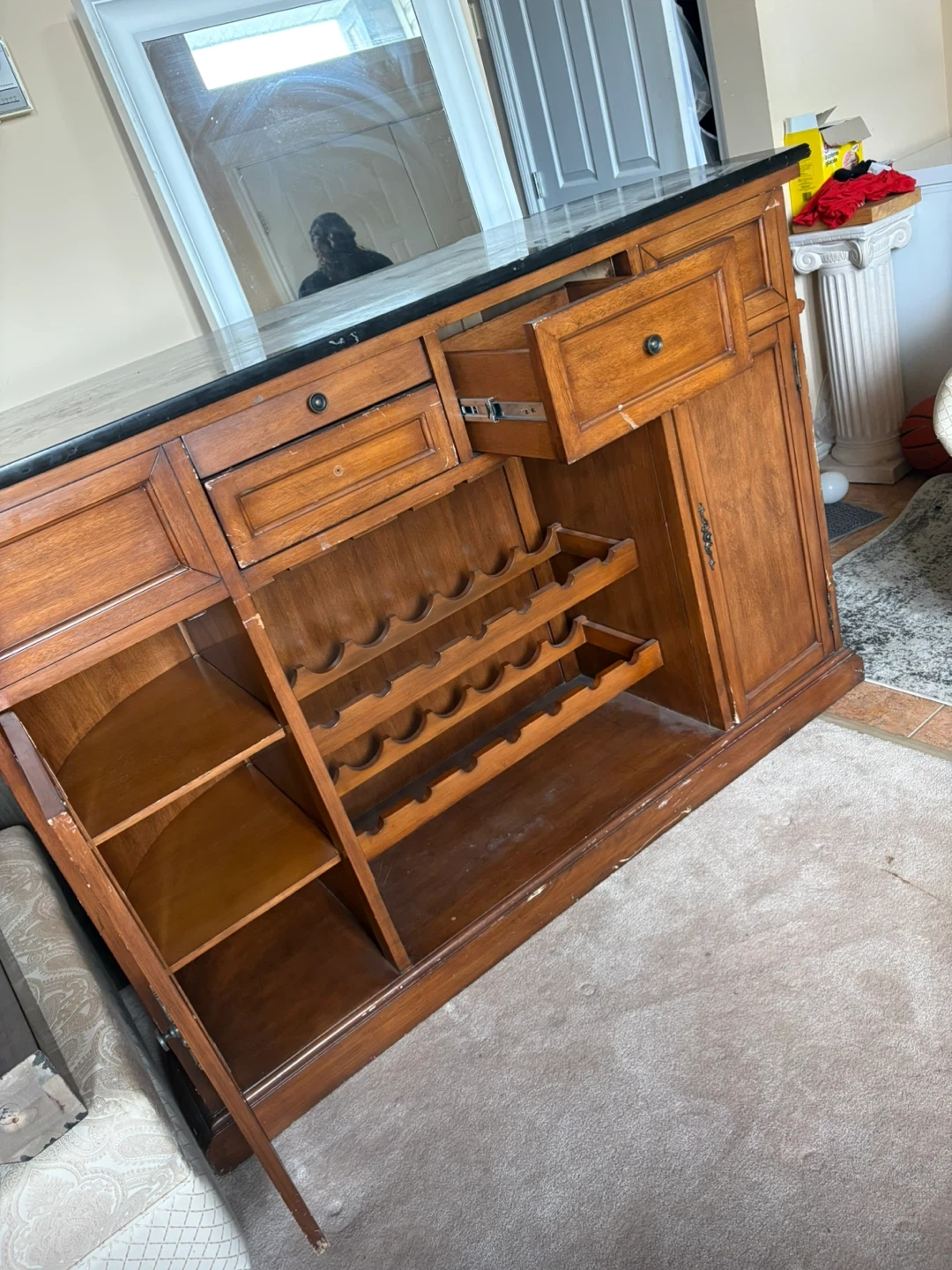Selling a wooden bar cabinet. It features a black countertop, drawers, shelves, and wine storage. Great for home entertaining! Marble deficiency on one corner but not noticeable. Needs to be patched properly.