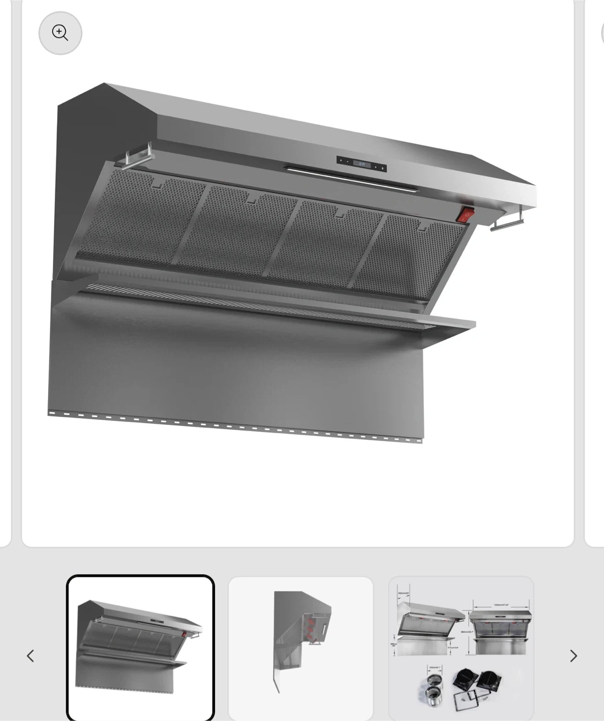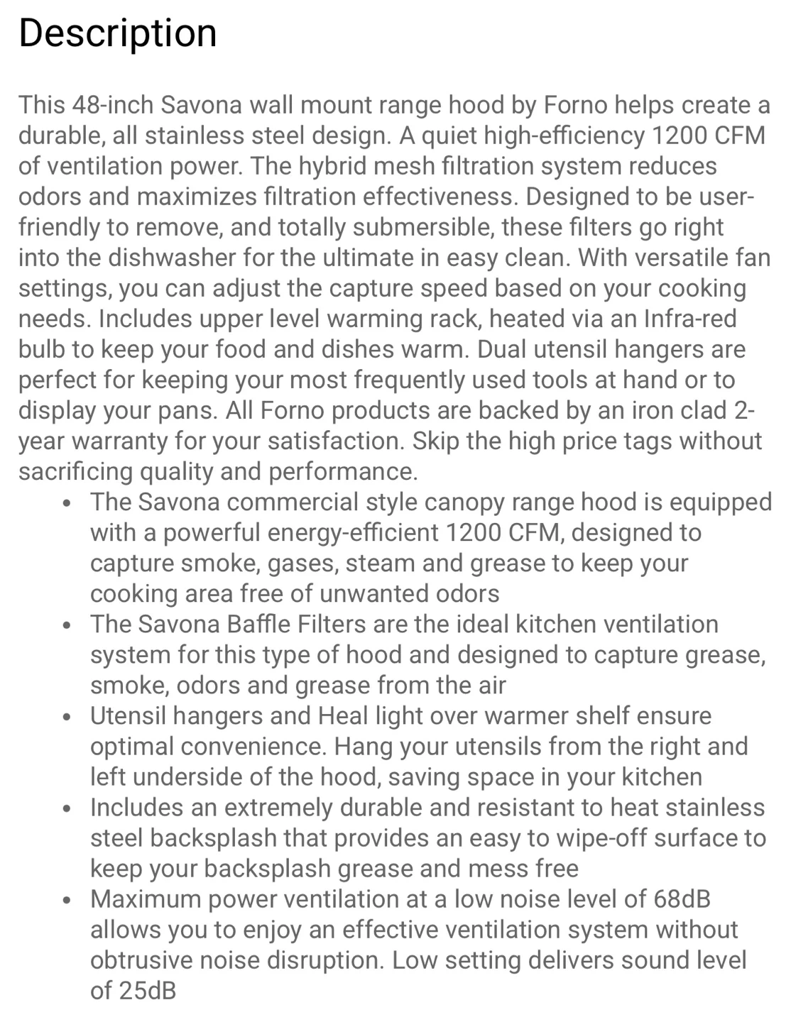 This 48-inch wall mount range hood is made of durable stainless steel. It features a hybrid mesh filtration system and adjustable capture speed. Includes upper level warming rack, infra-red bulb, and dual utensil hangers. It's designed for powerful ventilation of 1200 CFM. Dishwasher-safe filters make cleaning easy!