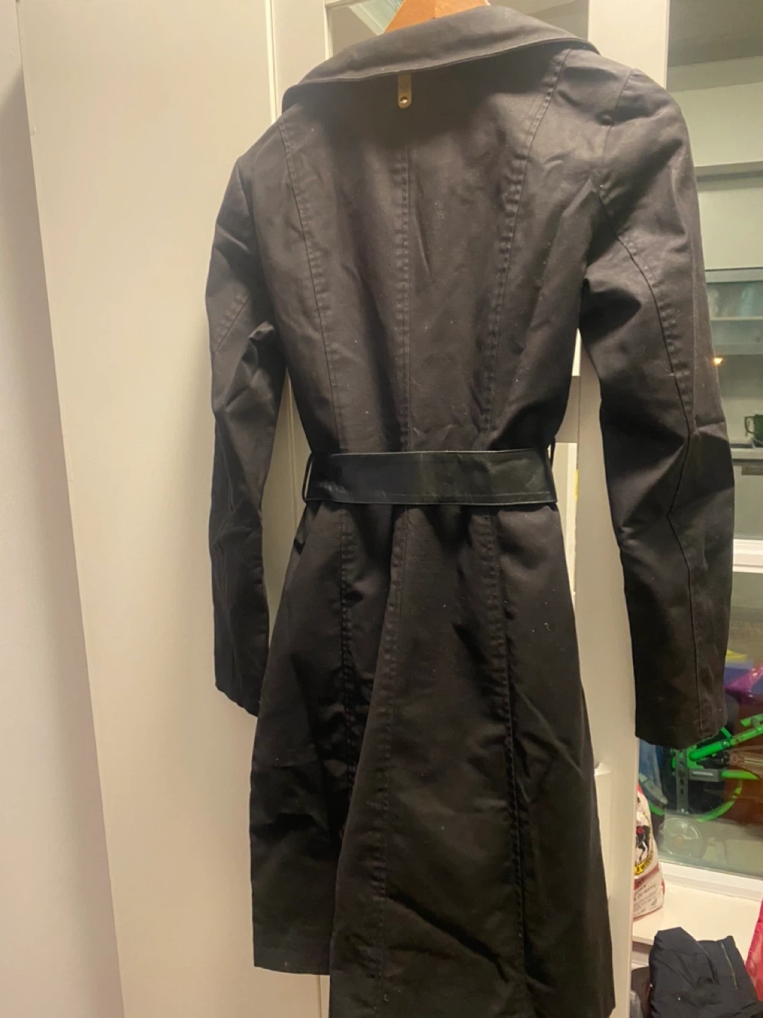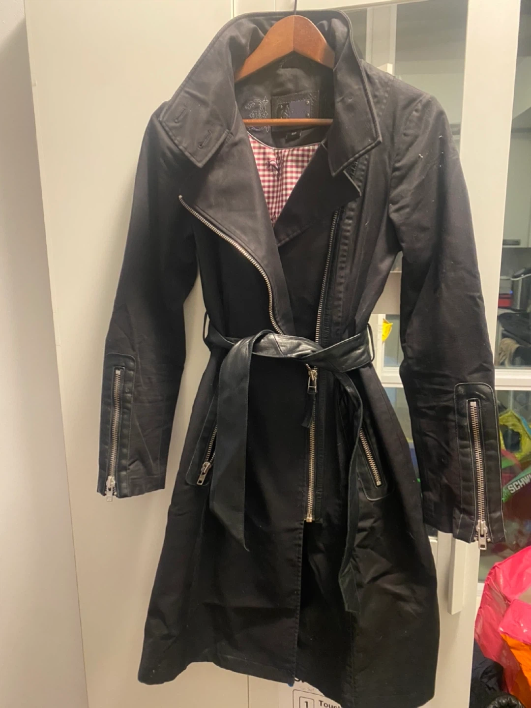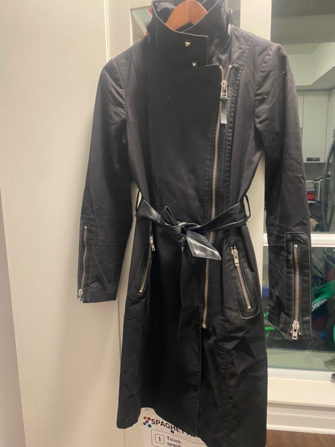 Selling a stylish black Mackage trench coat in size small. It features a sleek design with zipper details and a belt to cinch the waist. Perfect for adding a touch of sophistication to your wardrobe!