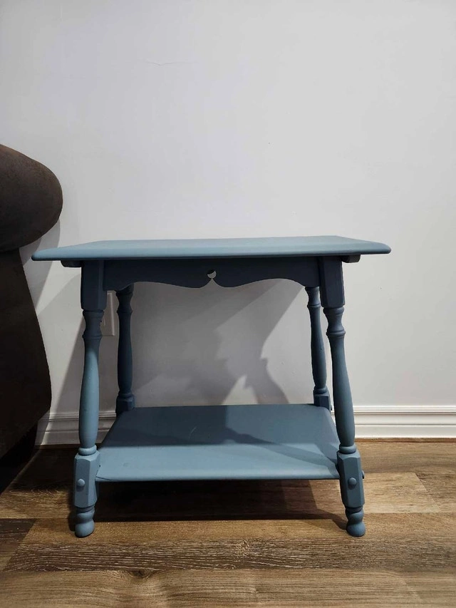 This blue table brings a touch of rustic charm with its sturdy construction and unique, hand-painted finish. Perfect as a side table or nightstand, it features a top surface and a lower shelf for extra storage or display. This is a used item. Unfortunately, I don't have specific measurements for this table. I'm pricing it at $45, based on similar tables listed on Kijiji. If the ad is still up, it's available! Don't miss out on adding this lovely piece to your home; it's waiting to be whisked away to its new abode. Cash accepted.