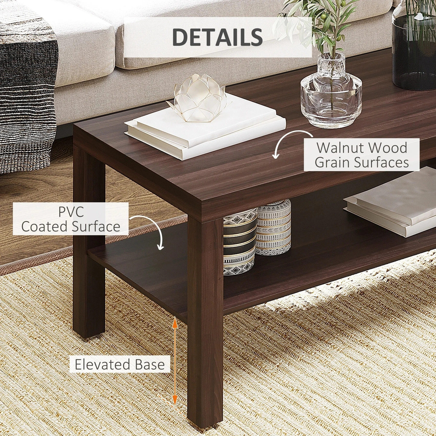2 Tier Coffee Table with Storage Shelf, Rectangular Center Table for Living Room, Home Office Furniture Walnut