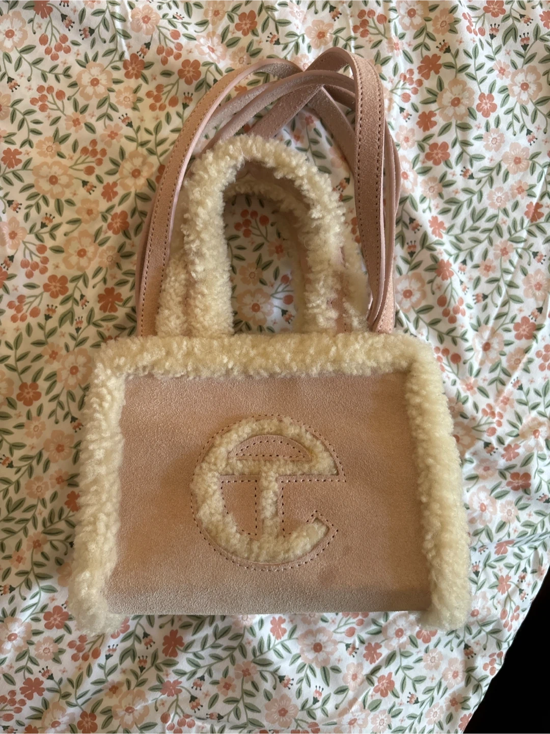 This is a pink suede Telfar Shopping Bag with shearling trim. It's a stylish accessory for everyday use. The bag has dual top handles. It's a small size.