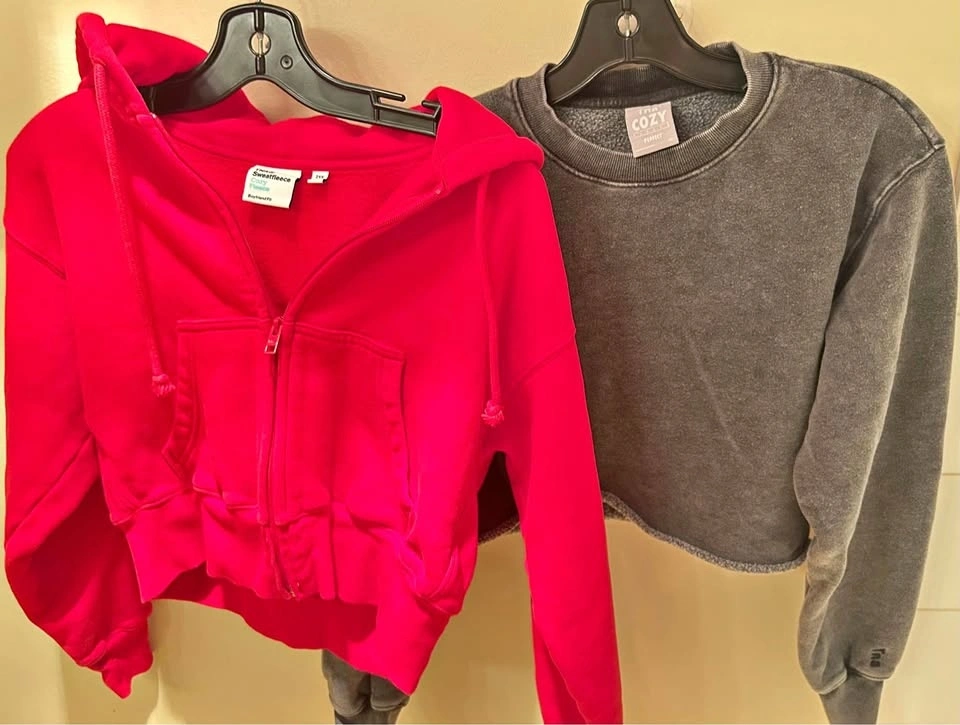 $30 for the red boyfriend fit sweater (2XS) and $20 for the grey cozy fleece sweater (XS). Never actually worn them. Selling both for $50.