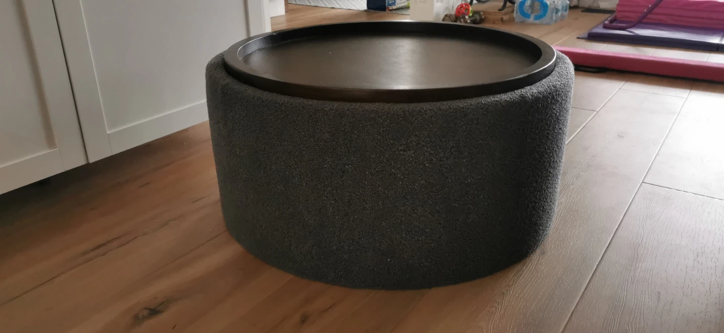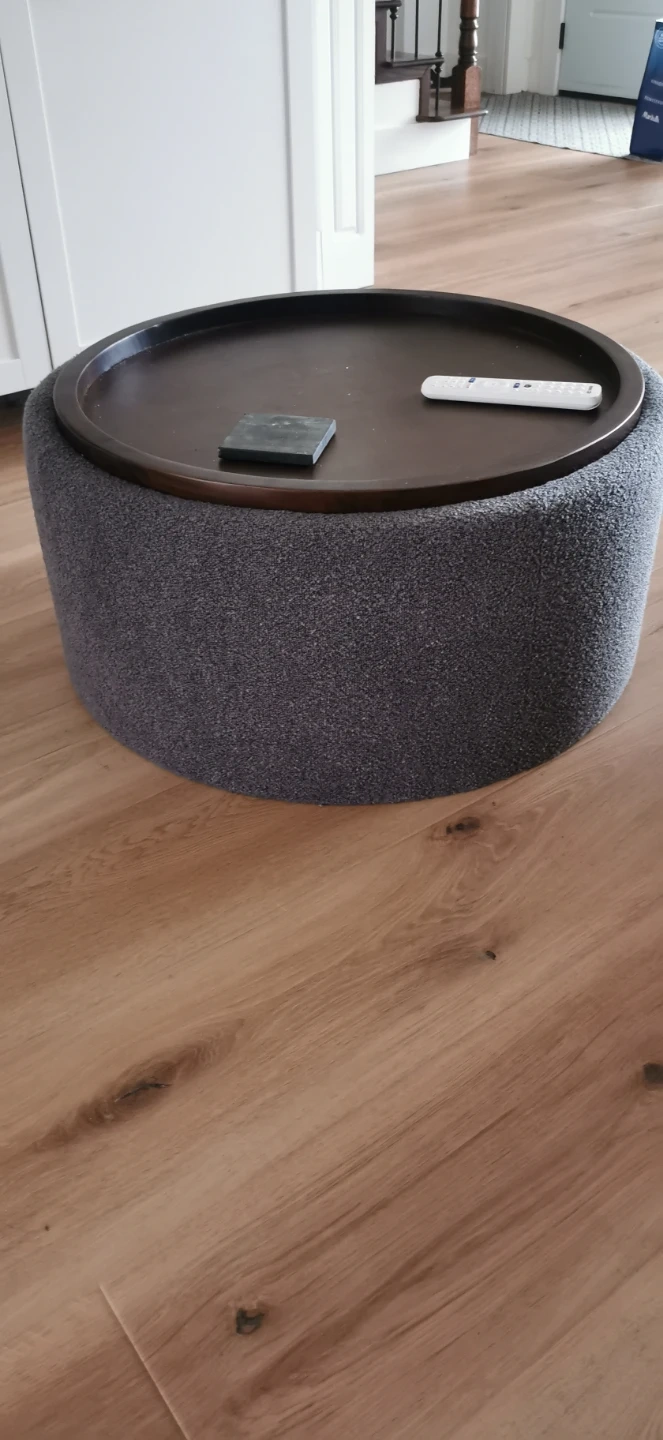 Round storage ottoman with a textured grey fabric exterior and a wooden tray top. It's great for extra seating or as a coffee table. Offers convenient storage inside!