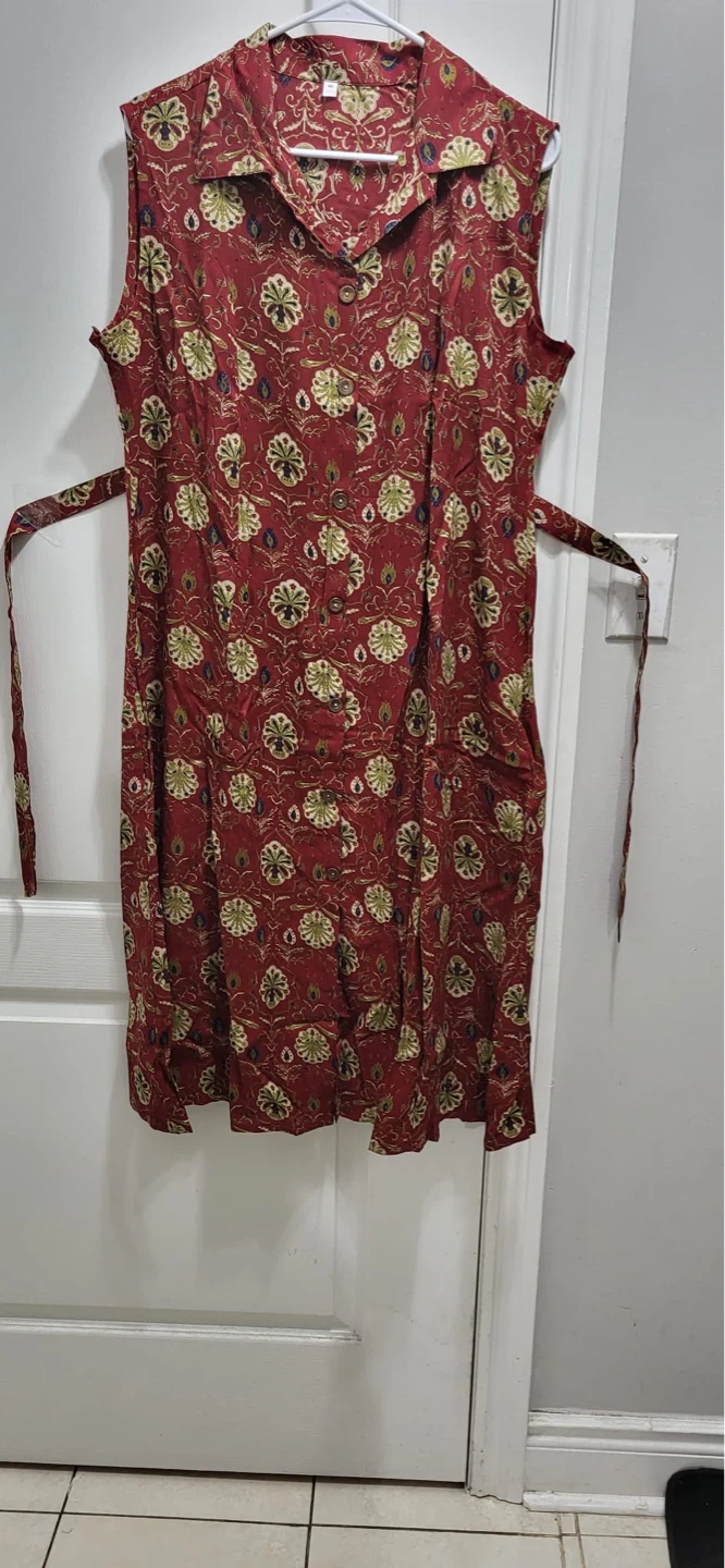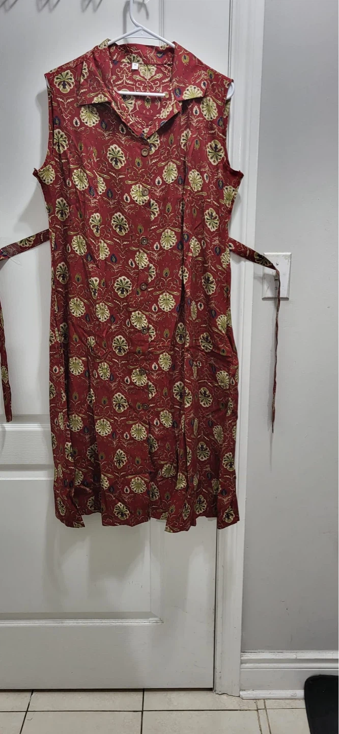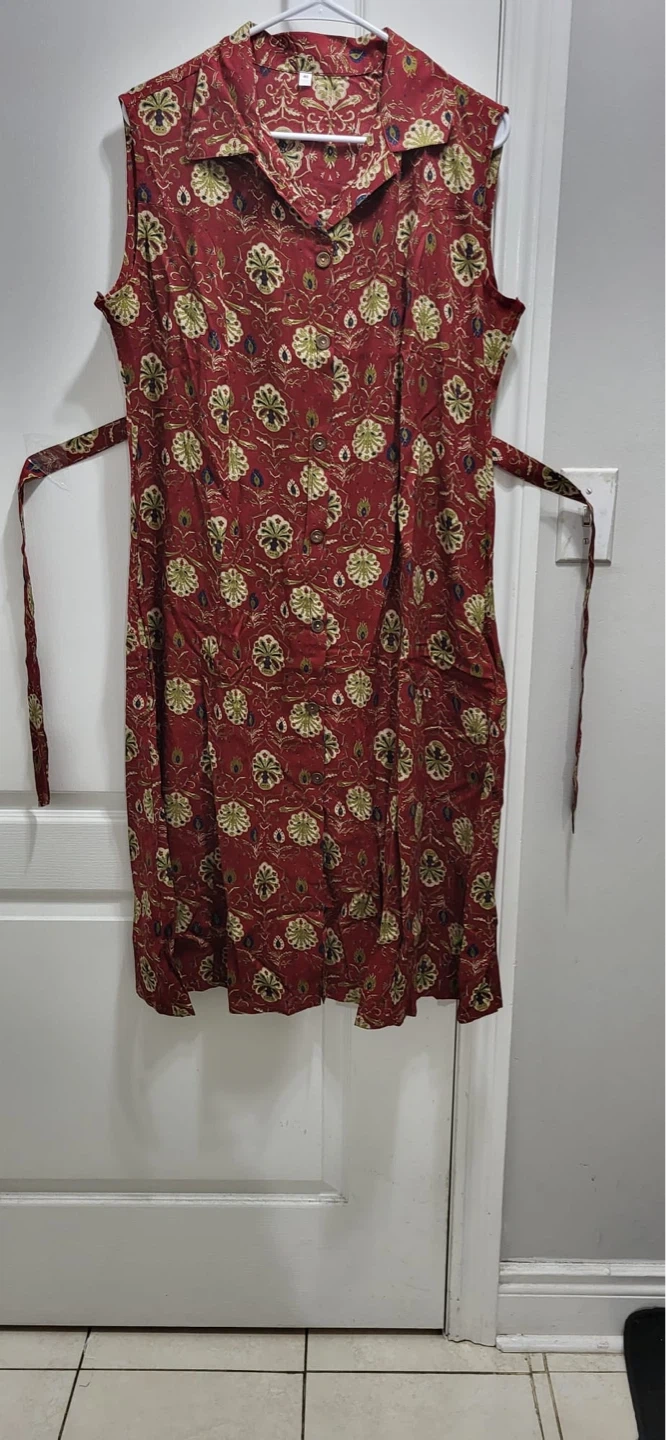 This sleeveless dress features a lovely all-over red floral print with a collared neckline. It includes a matching tie belt to cinch the waist. Made from a lightweight fabric, it's perfect for warmer weather!