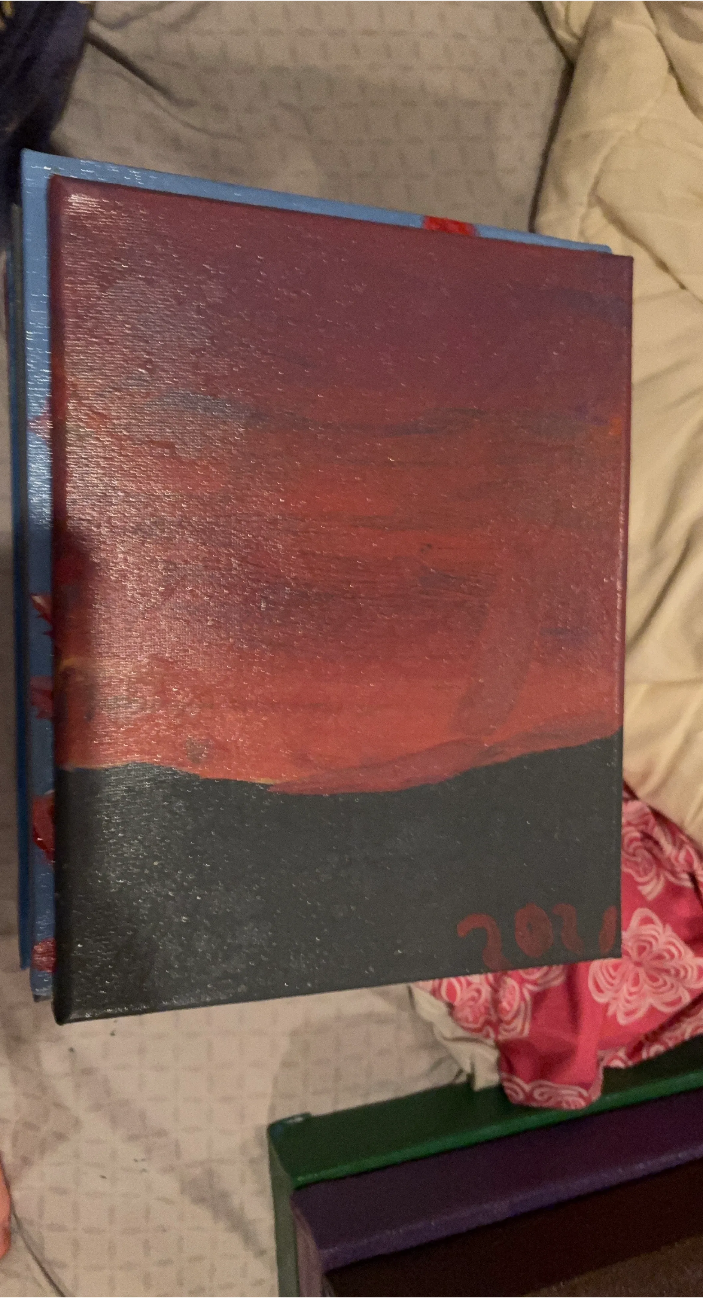 Selling an original sunset painting on canvas. It features a blend of red and black, with a blue painted edge. The painting appears to be signed with the year 2010.