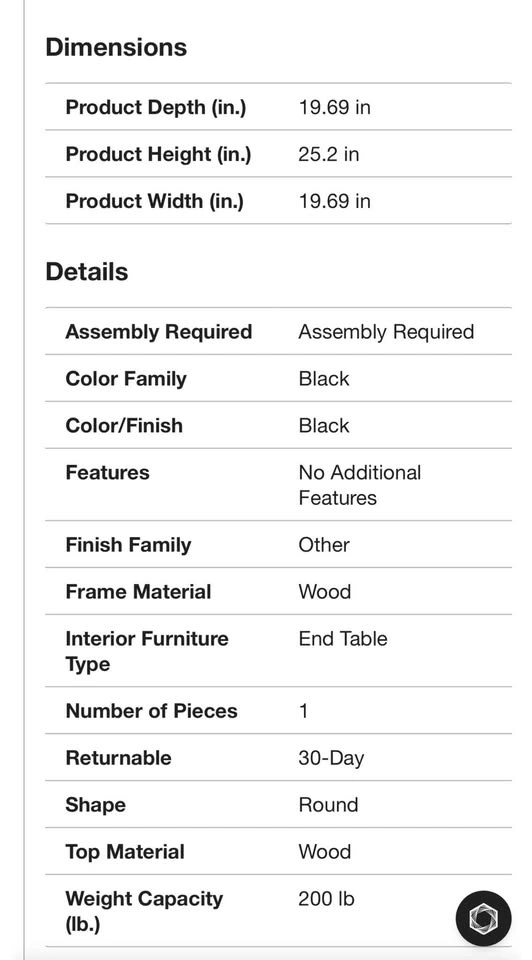 If ads up it's available. Only inquire if you're serious. Price is not negotiable. Condition: NEW. Product: Round End Table / Side Table. Color: Black. Frame Material: Solid Wood. Dimensions: 19.69" W x 19.69" D x 25.2" H. Number of Pieces: 1. Assembly: Required.