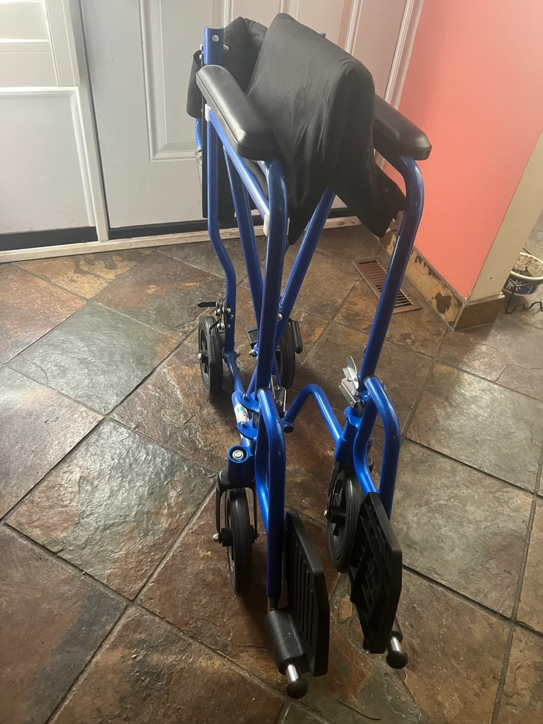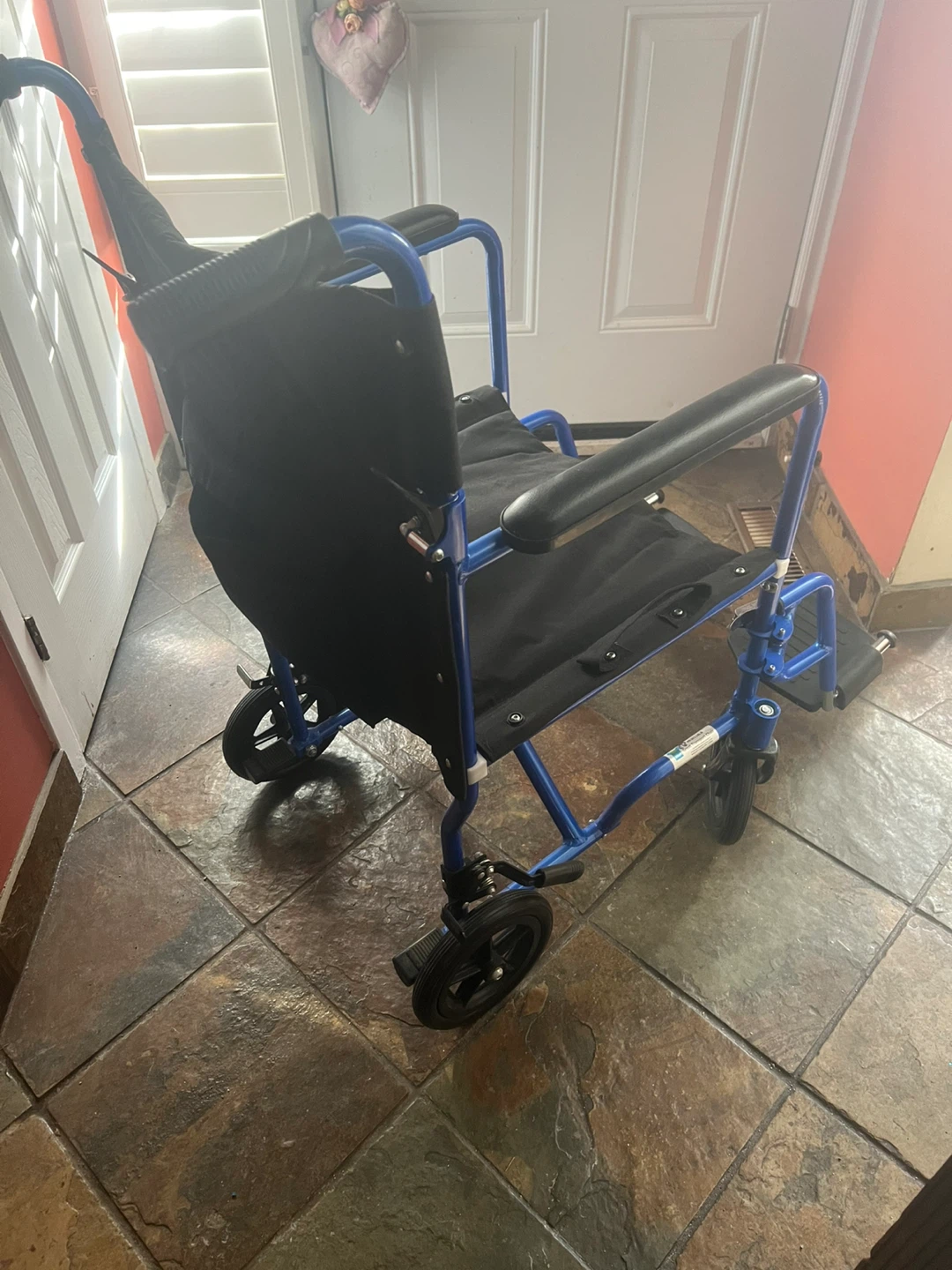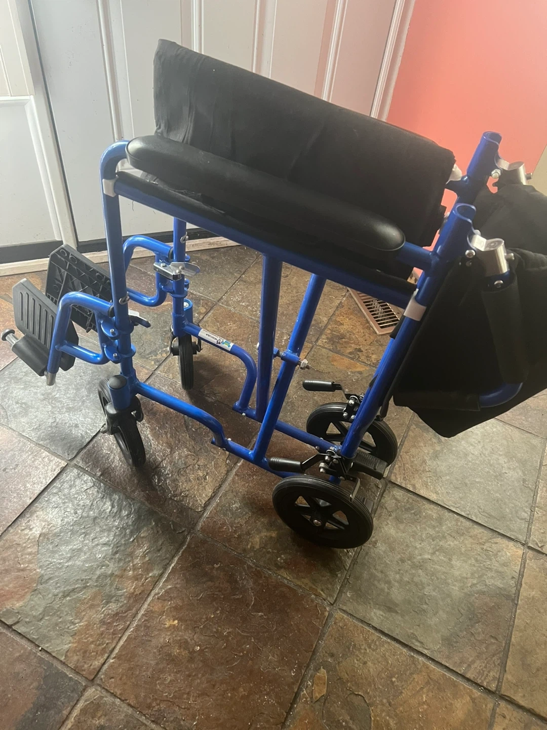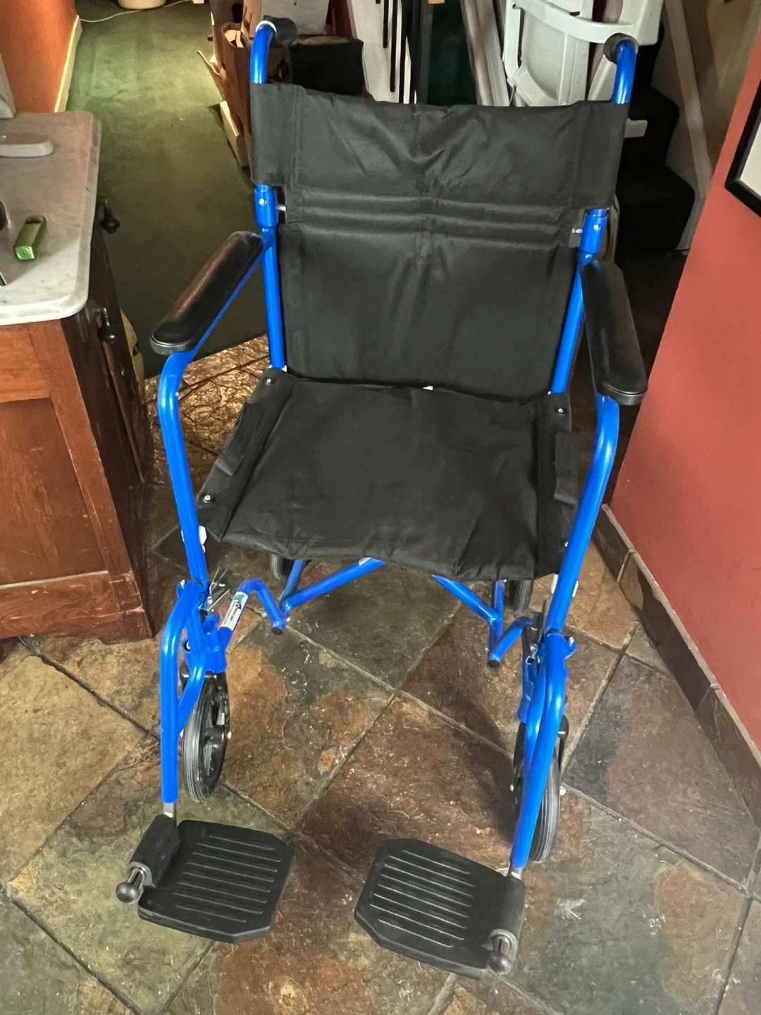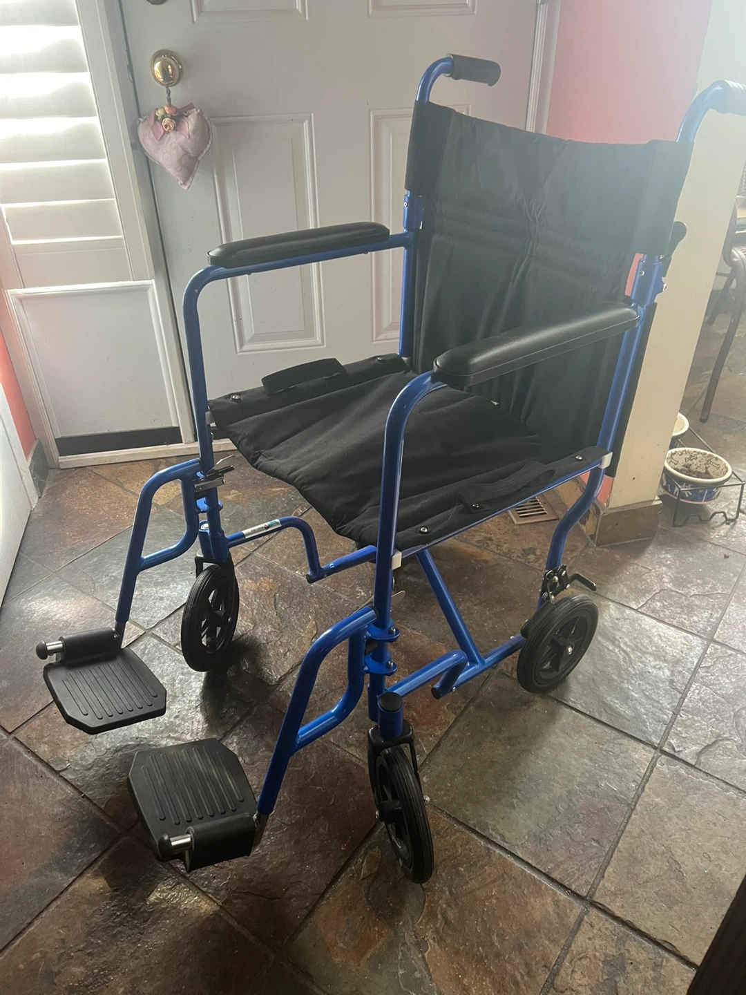 Lightweight blue transport wheelchair with black seat and armrests. It's foldable for easy storage and transport. Perfect for moving around the house or for short trips. Has removable foot rest