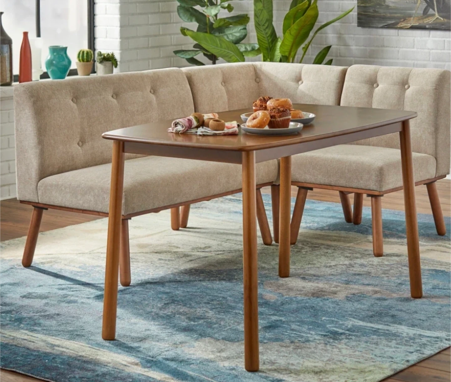 Celebrate a minimalist lifestyle with the understated design and cool colors of this Playmate loveseat from Simple Living. Walnut-finished solid-wood legs and foam padding provide comfort and support, while the button-tufted chair back adds a mid-century touch to your space. Matching chair, corner chair, and table sold separately