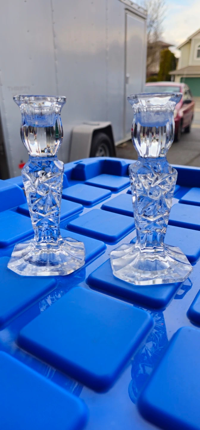 A lovely set of two clear crystal glass candlesticks. They feature a patterned stem and a classic design for holding taper candles. These would be nice for a dining table or mantelpiece.