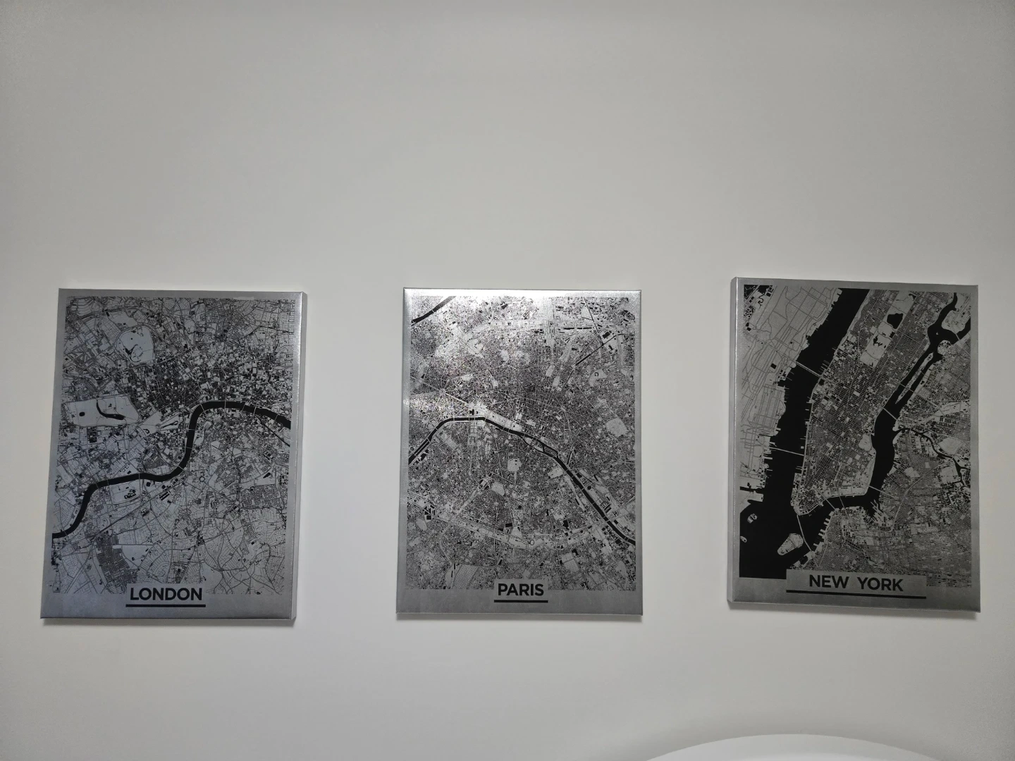 This is a wall art canvas featuring a detailed map of New York City. It's designed with a silver and black colour scheme. Perfect for displaying your love for the city!