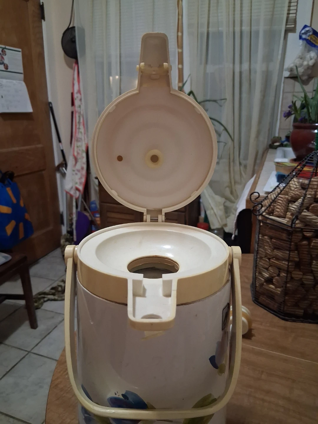 This vintage thermos dispenser features a floral design and a built-in pump for easy pouring. It's ideal for keeping beverages hot or cold for extended periods. The dispenser has a capacity suitable for gatherings or daily use.