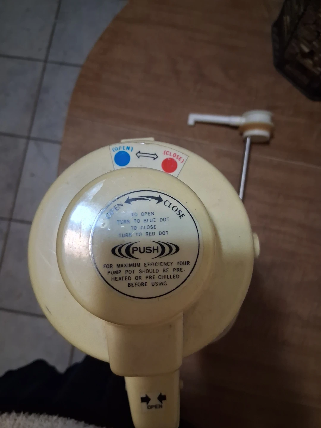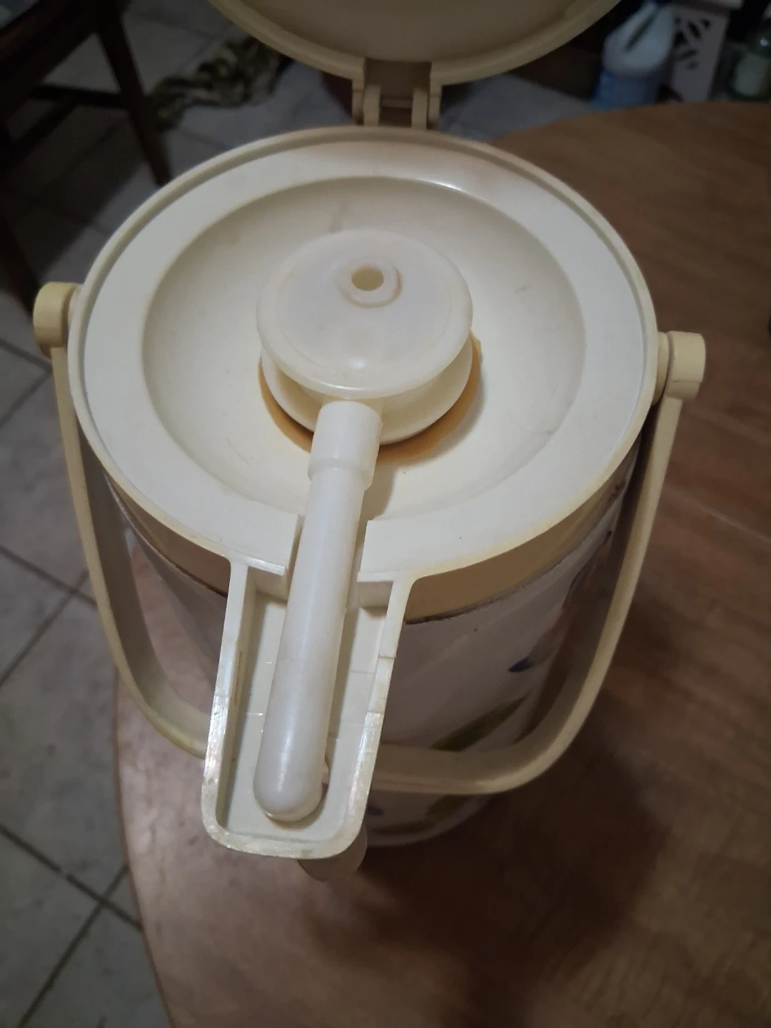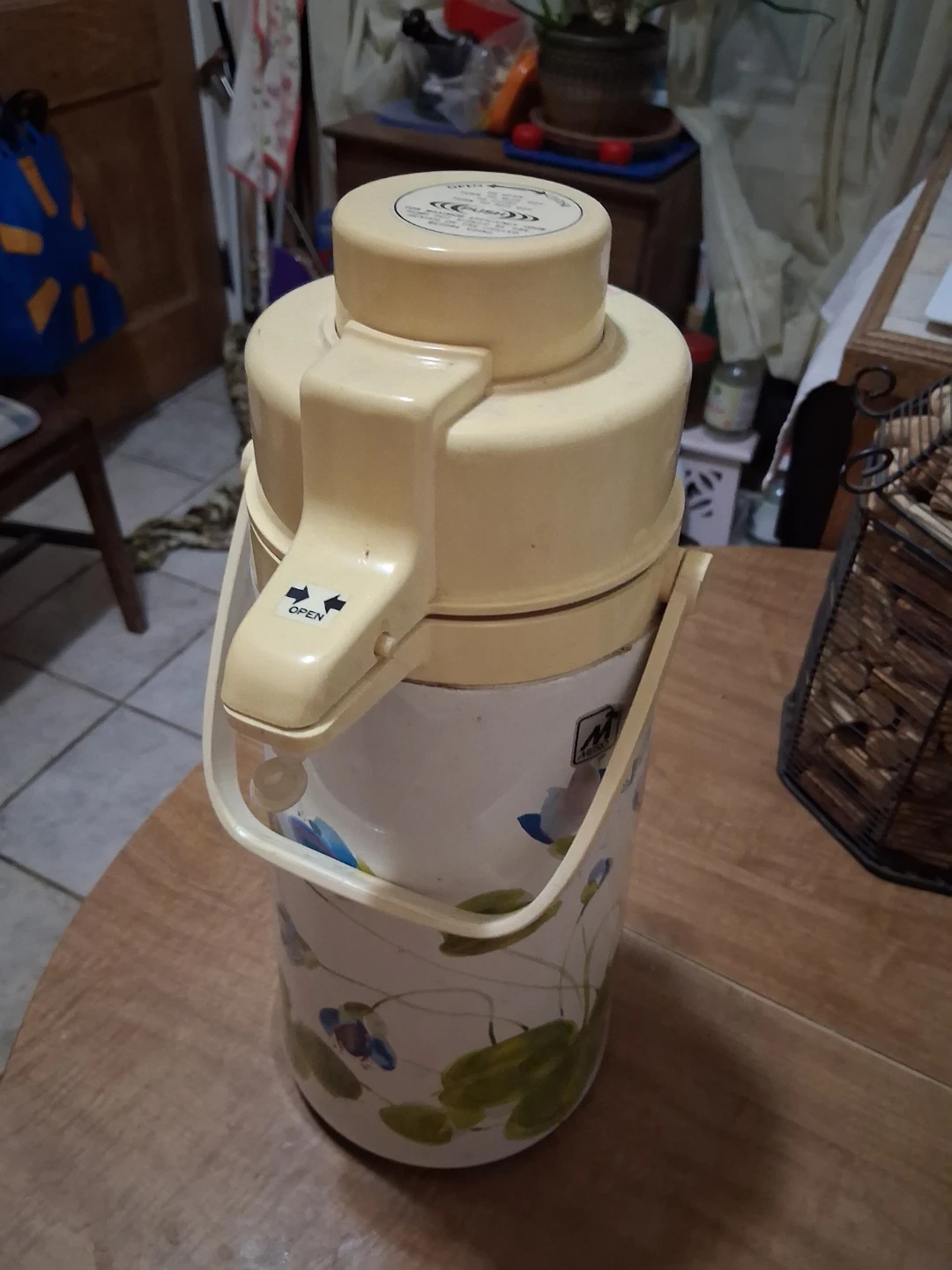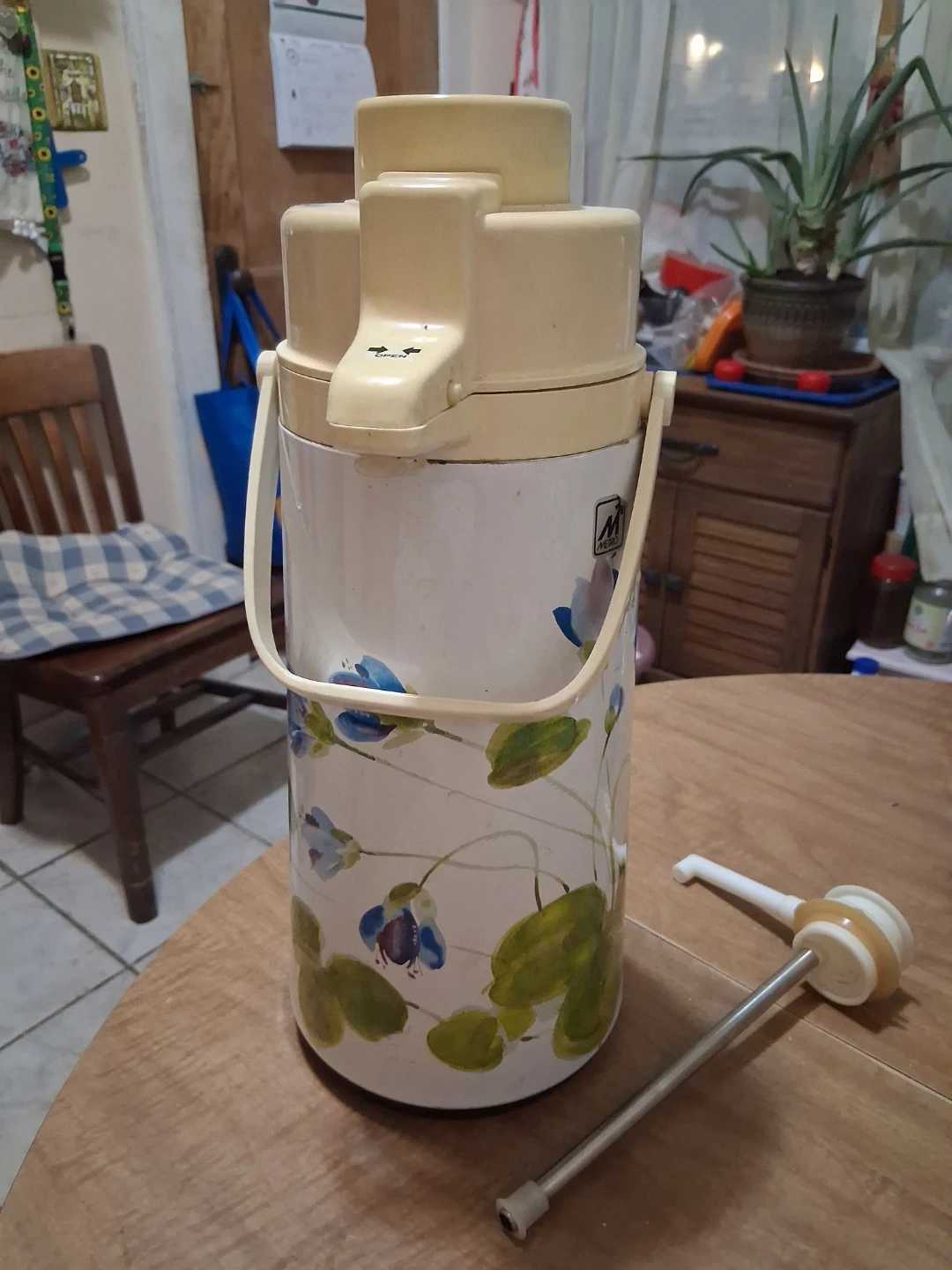 This vintage thermos dispenser features a floral design and a built-in pump for easy pouring. It's ideal for keeping beverages hot or cold for extended periods. The dispenser has a capacity suitable for gatherings or daily use.