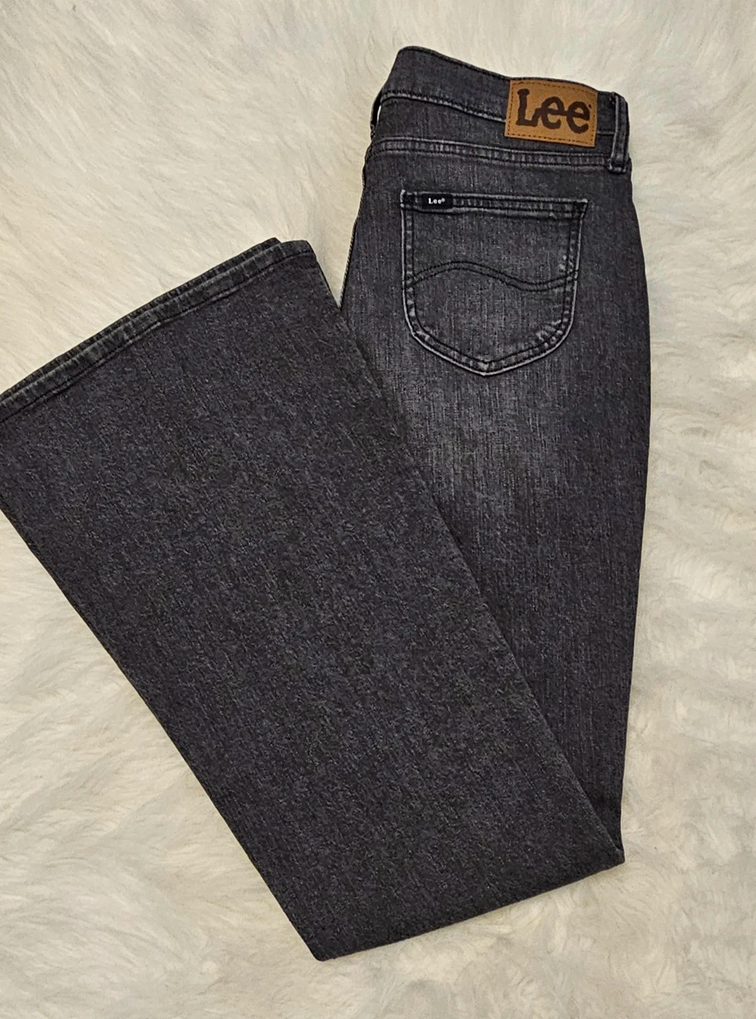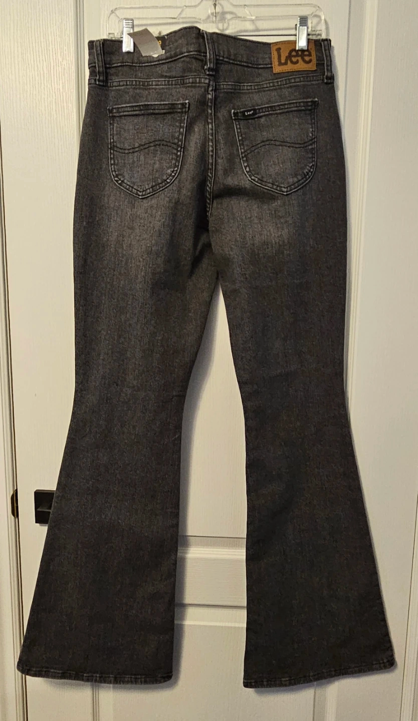 These are Lee women's flare jeans in a Blurred Dark, Legendary Style, Mid-rise. They're made from denim fabric. Flare leg style.