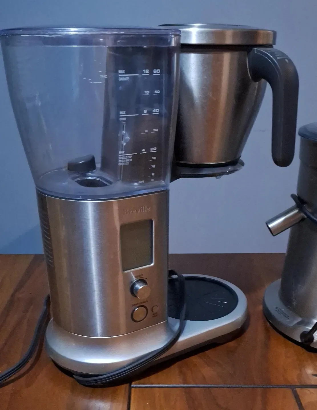 Breville coffee maker with a brushed stainless steel finish. Features a carafe and single-cup brew options. The water reservoir has clear measurement markings for cups and carafes.