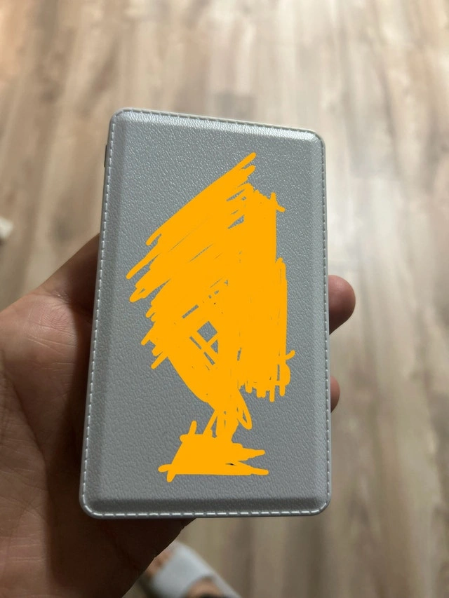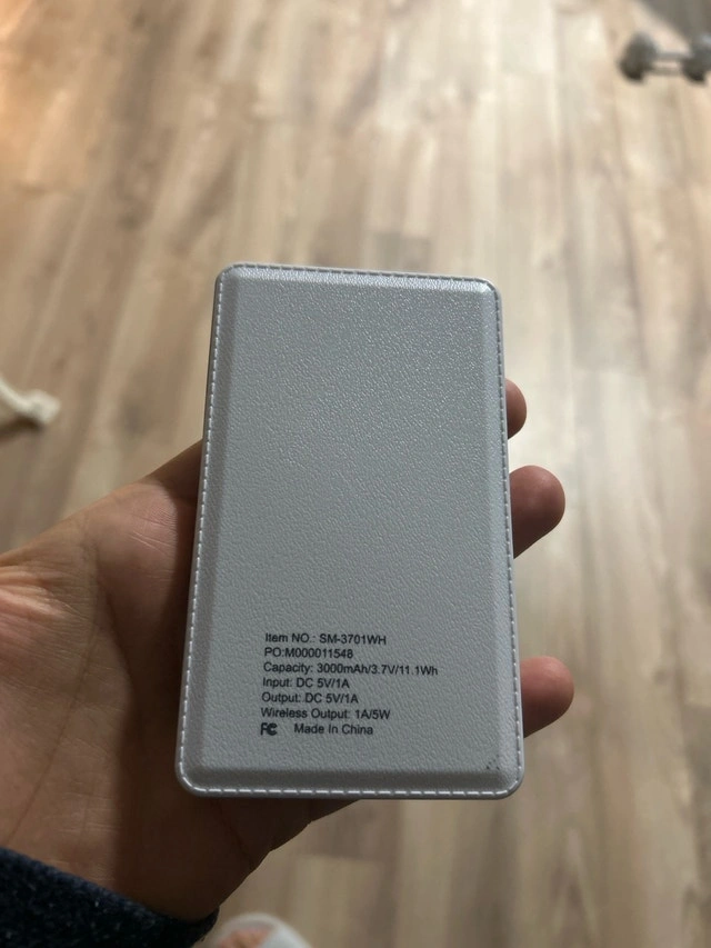 3 units available. White, leather-textured surface. Compact and slim design, easy to carry. Features wireless charging capability (up to 5W) and can also be used with standard USB output. Perfect for light daily use when you just need a backup charge for wireless charging compatible devices (phones, earbuds, etc.).