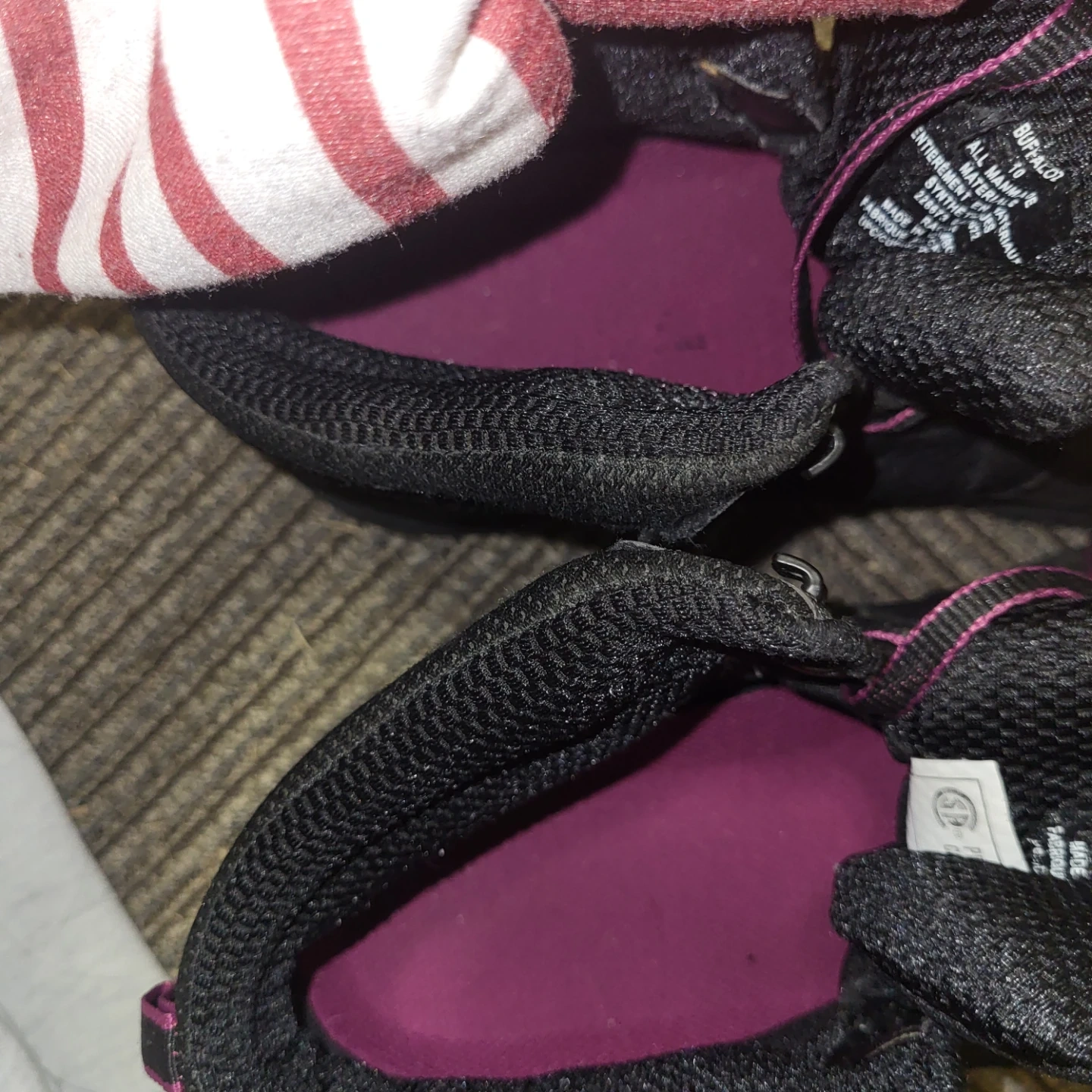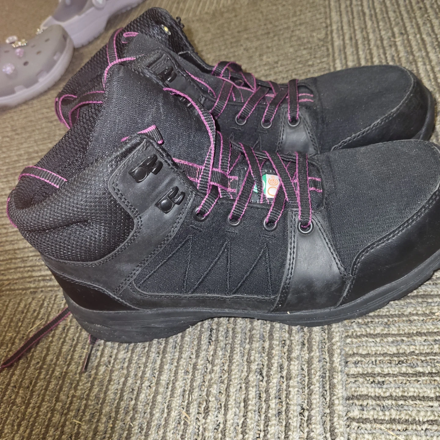 Black Buffalo work boots. All manmade materials. Waterproof just wear a few times still in good conditions.