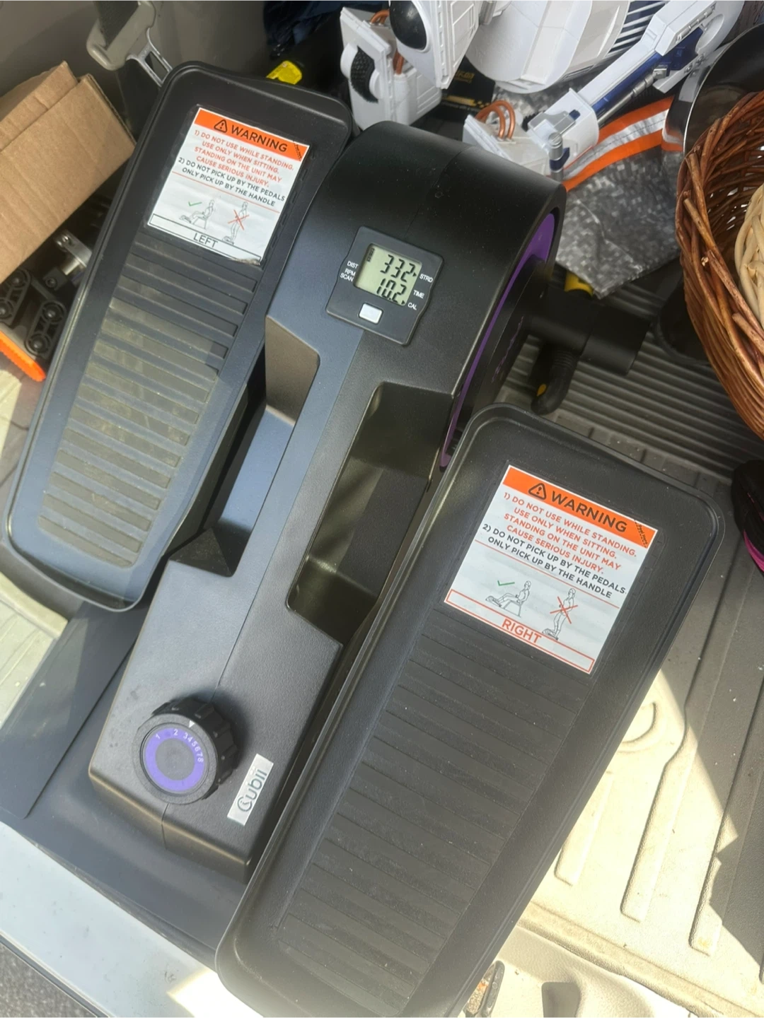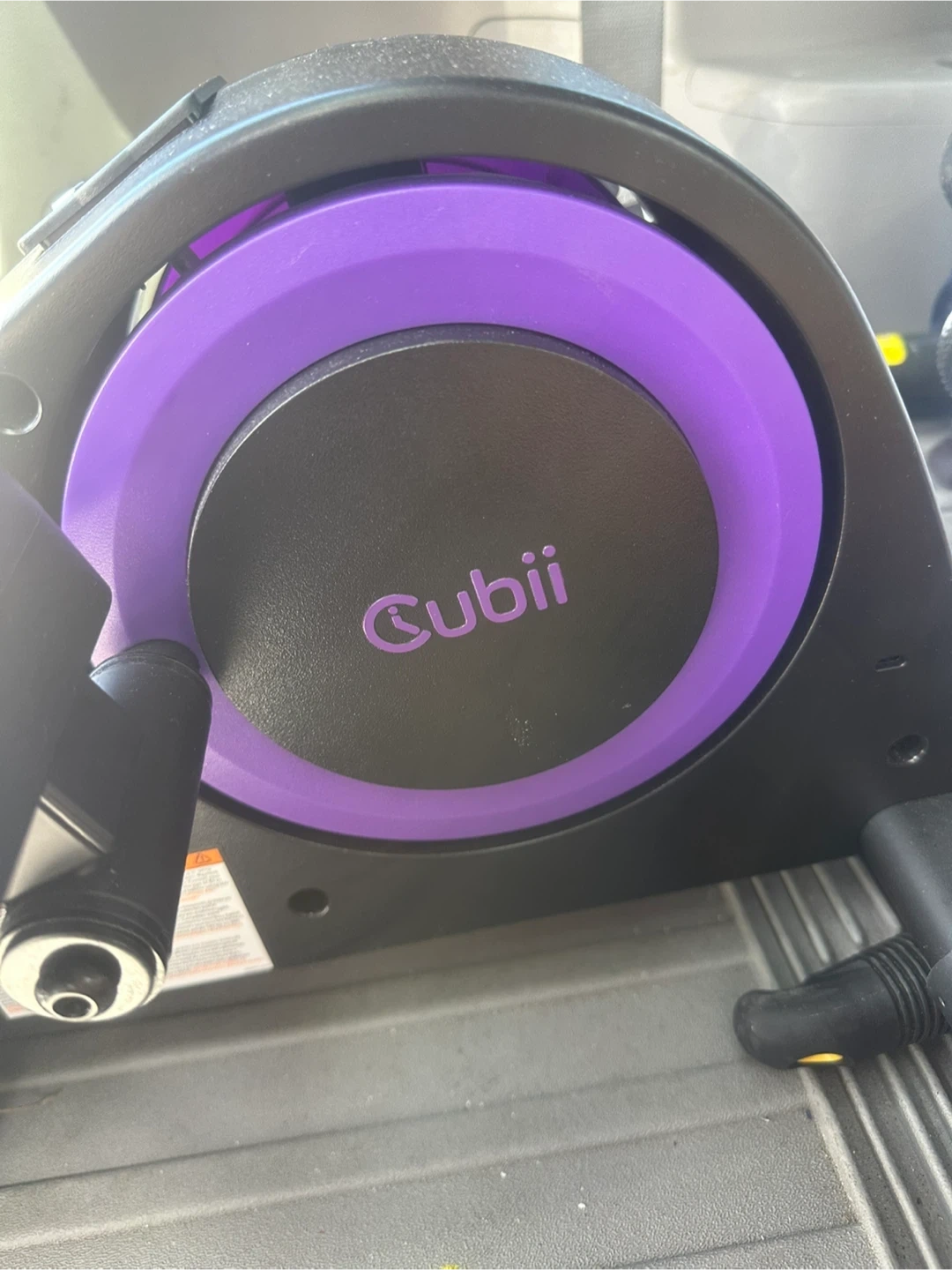 This is a Cubii under-desk elliptical. It's black with purple accents and features a digital display showing distance, RPM, time, and calories. It has 8 resistance levels.