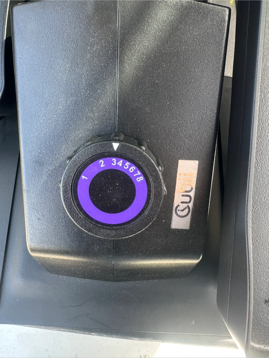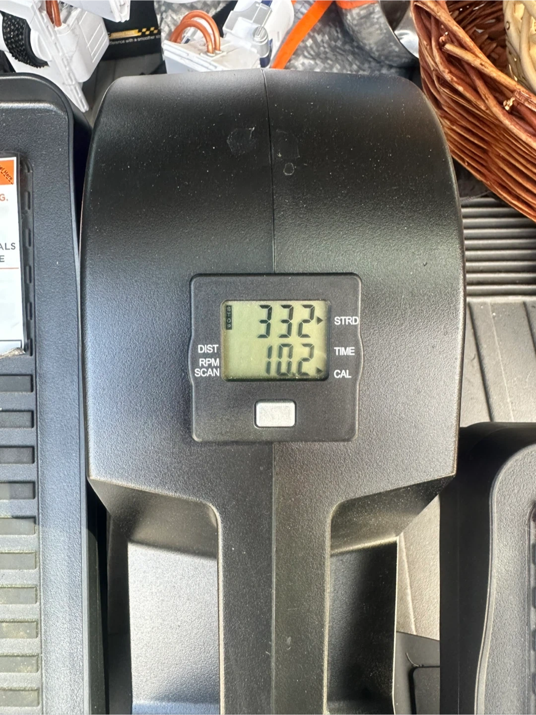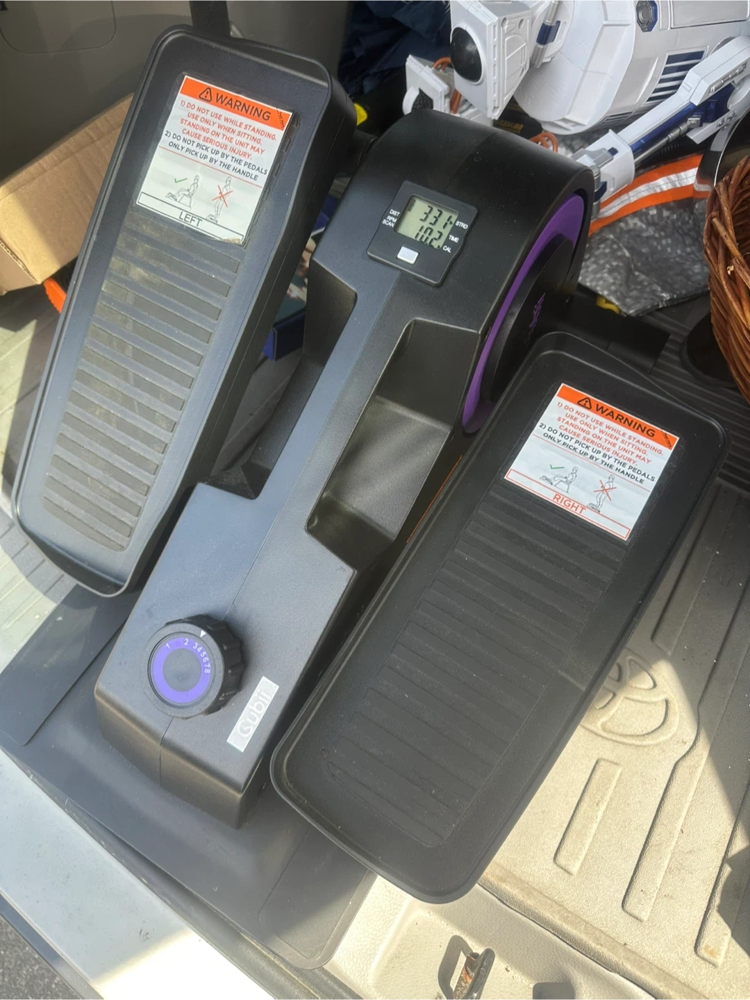 This is a Cubii under-desk elliptical. It's black with purple accents and features a digital display showing distance, RPM, time, and calories. It has 8 resistance levels.