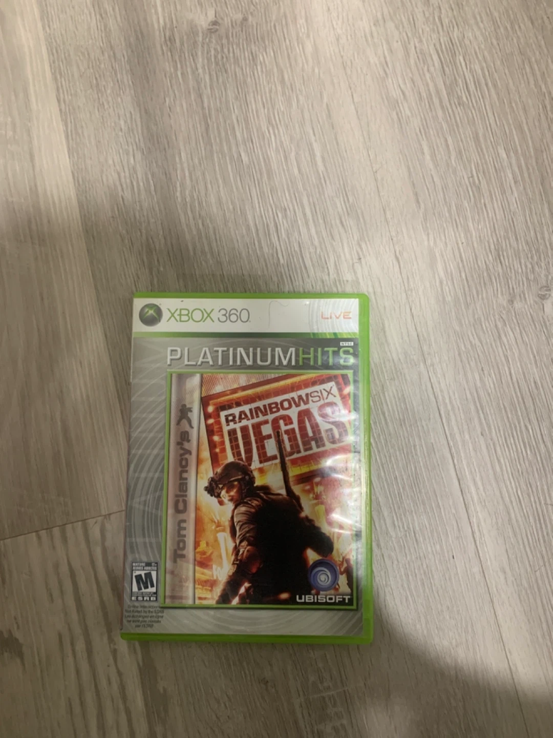 This is Tom Clancy's Rainbow Six Vegas for the Xbox 360 Platinum Hits edition. It's a tactical shooter game. This edition is part of the Platinum Hits series, often indicating a popular and critically acclaimed title.
