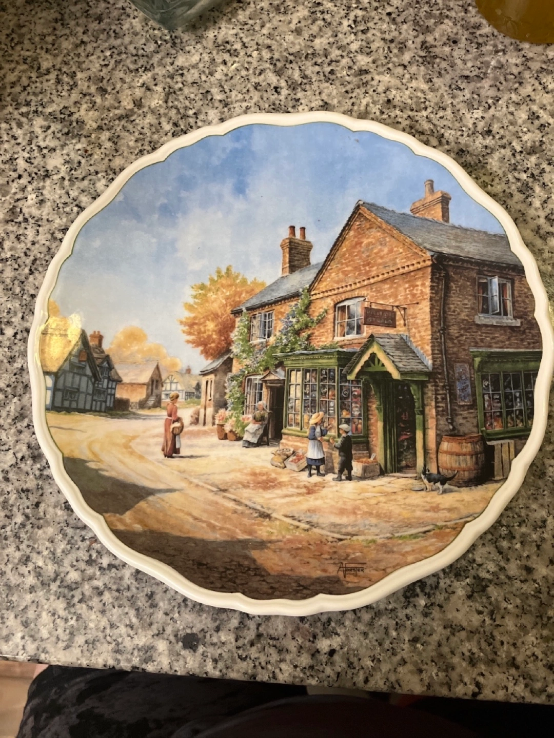 Beautiful collectible plate. Depicts an idyllic village scene. Part of the Village Life series by Anthony Forster. Scalloped edge. No chips. Excellent condition.