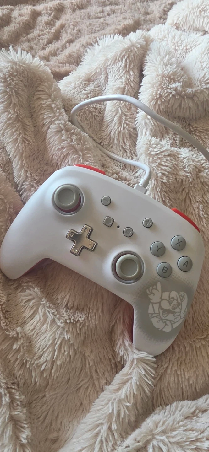 White Nintendo Switch Pro controller with red accents. Features a Mario graphic on the right grip. It's a wired controller, perfect for extended gaming sessions! Suitable for playing your favourite Switch games.