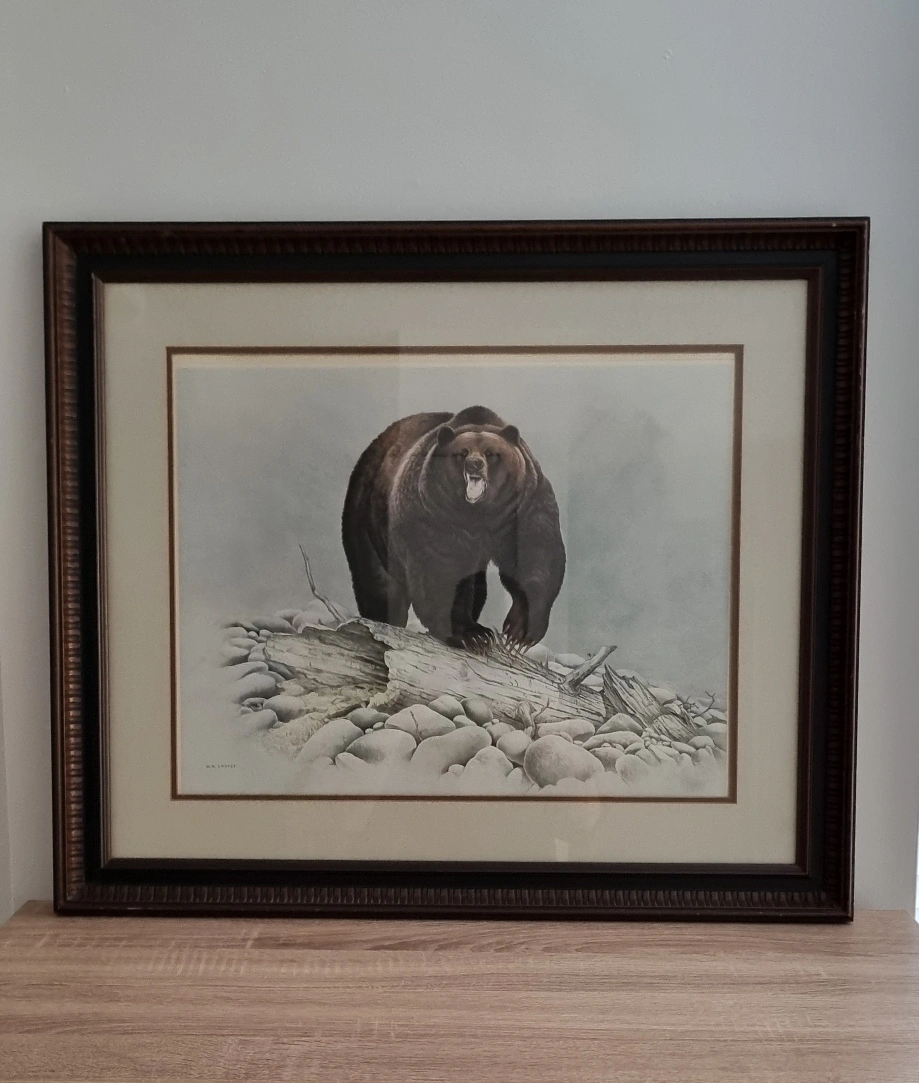 Framed print of a grizzly bear. The print is signed in the bottom right corner.