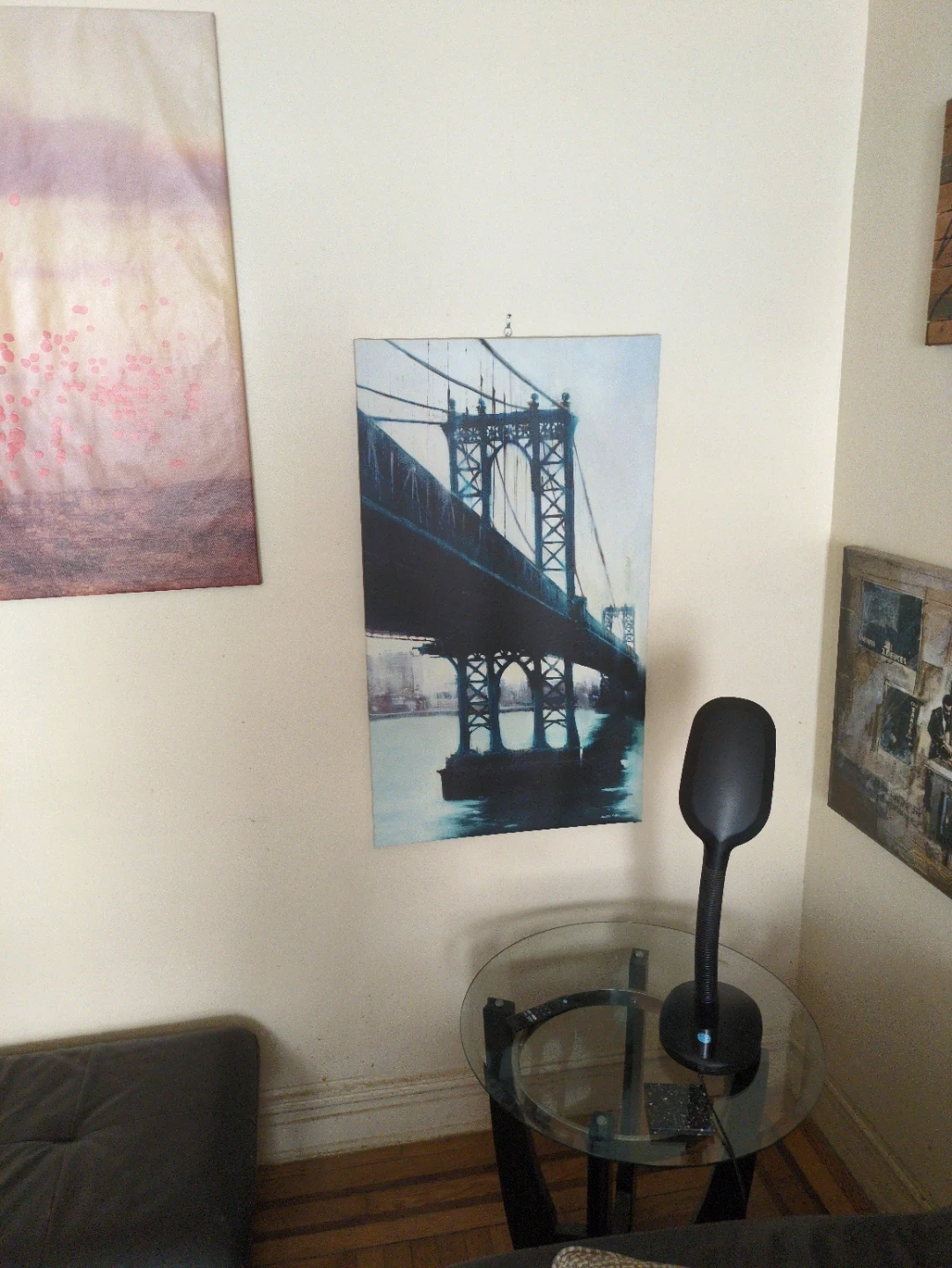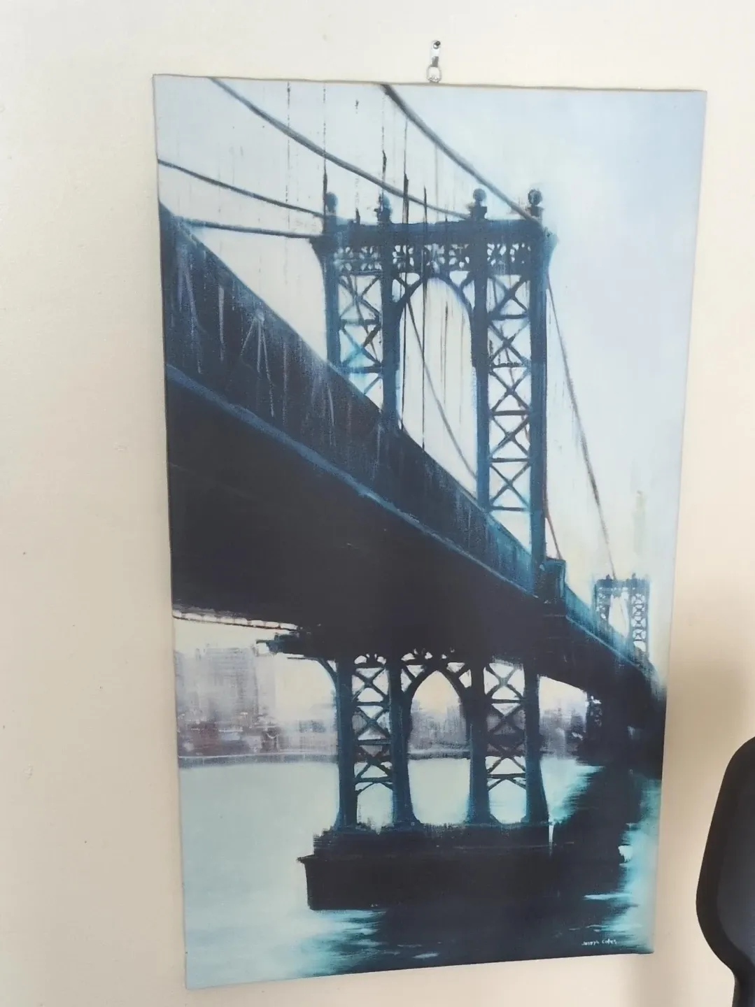 This is a canvas print featuring the Manhattan Bridge. It's a great piece of wall art for any New York City enthusiast. The print showcases a moody, atmospheric depiction of the iconic bridge. The dimensions are approximately 24 W X 42 inches.