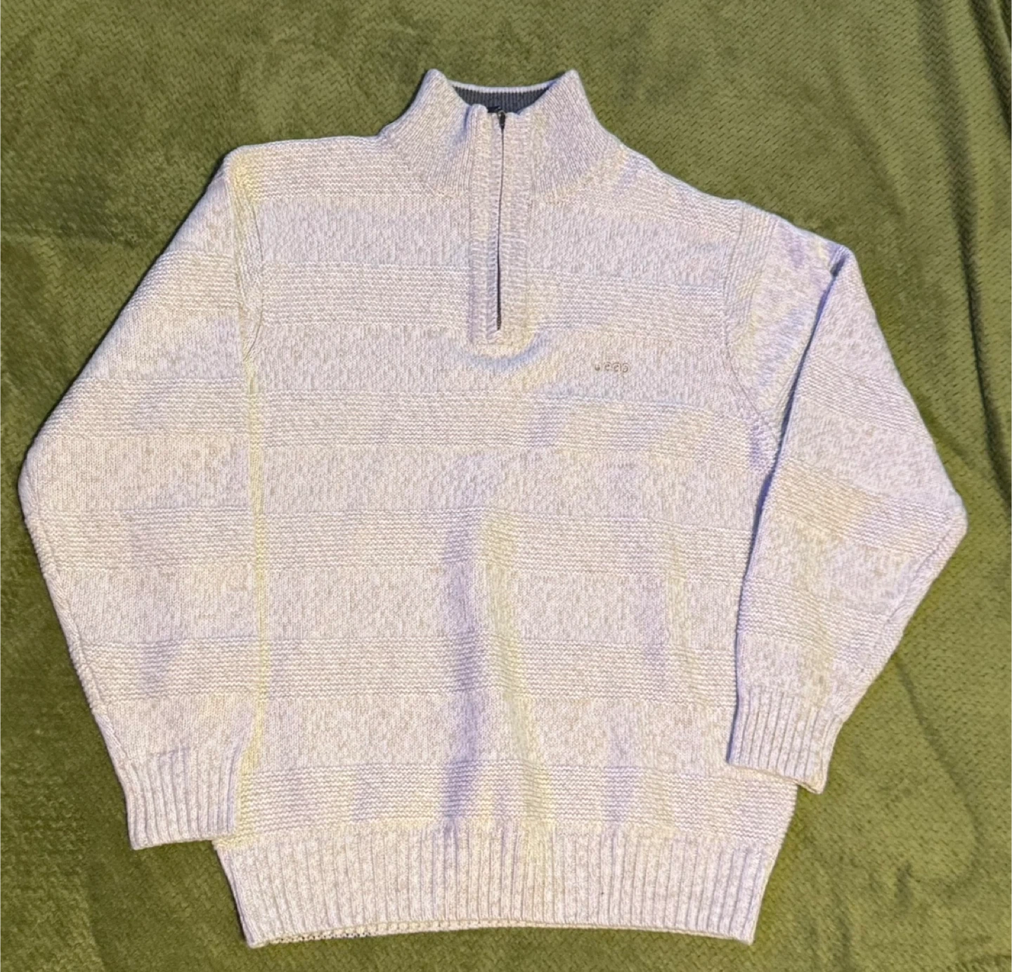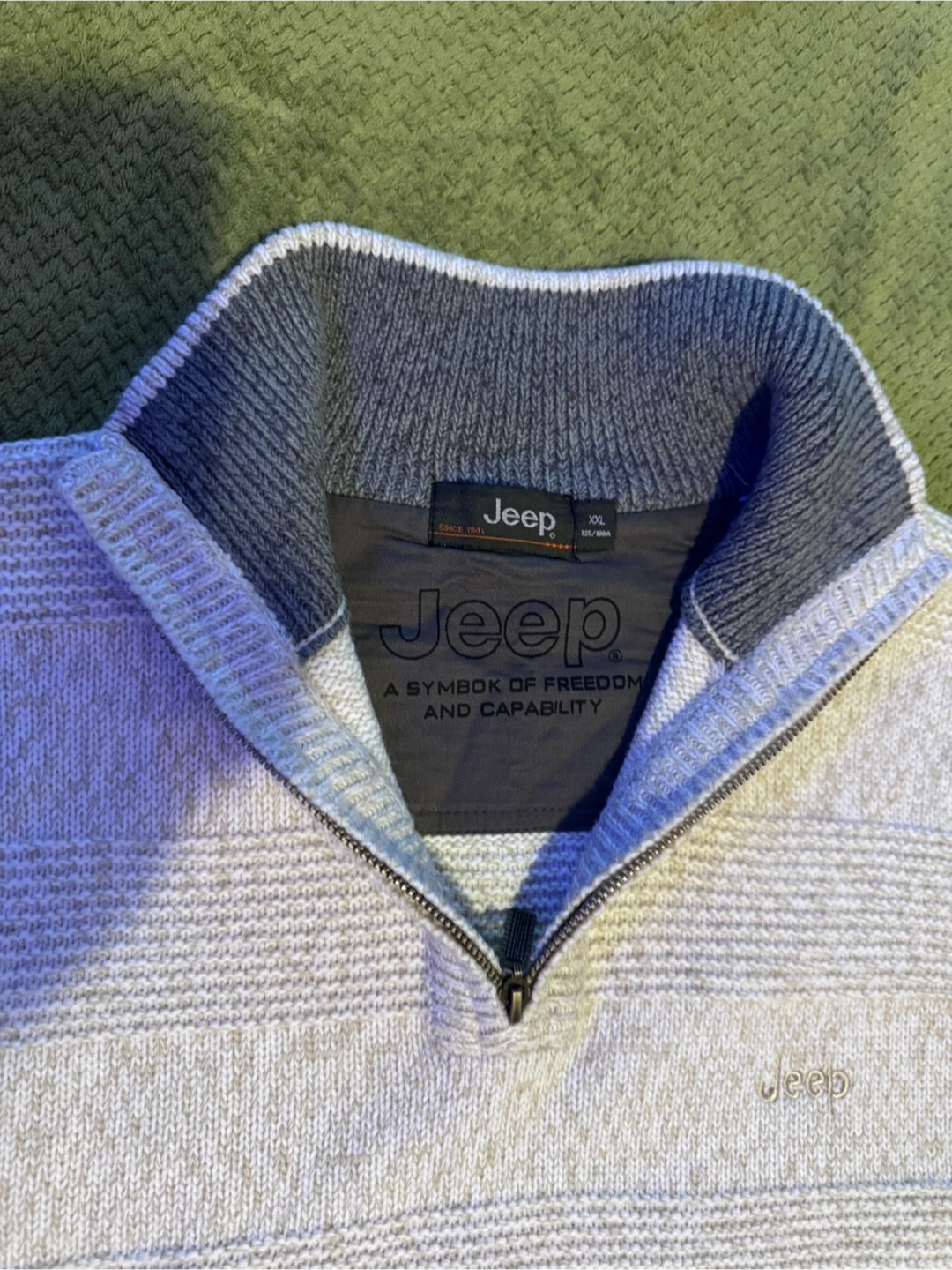 This Jeep sweater features a light grey and beige striped pattern. It's a size XXL with a quarter-zip neckline. Made with a knit material for comfort.
